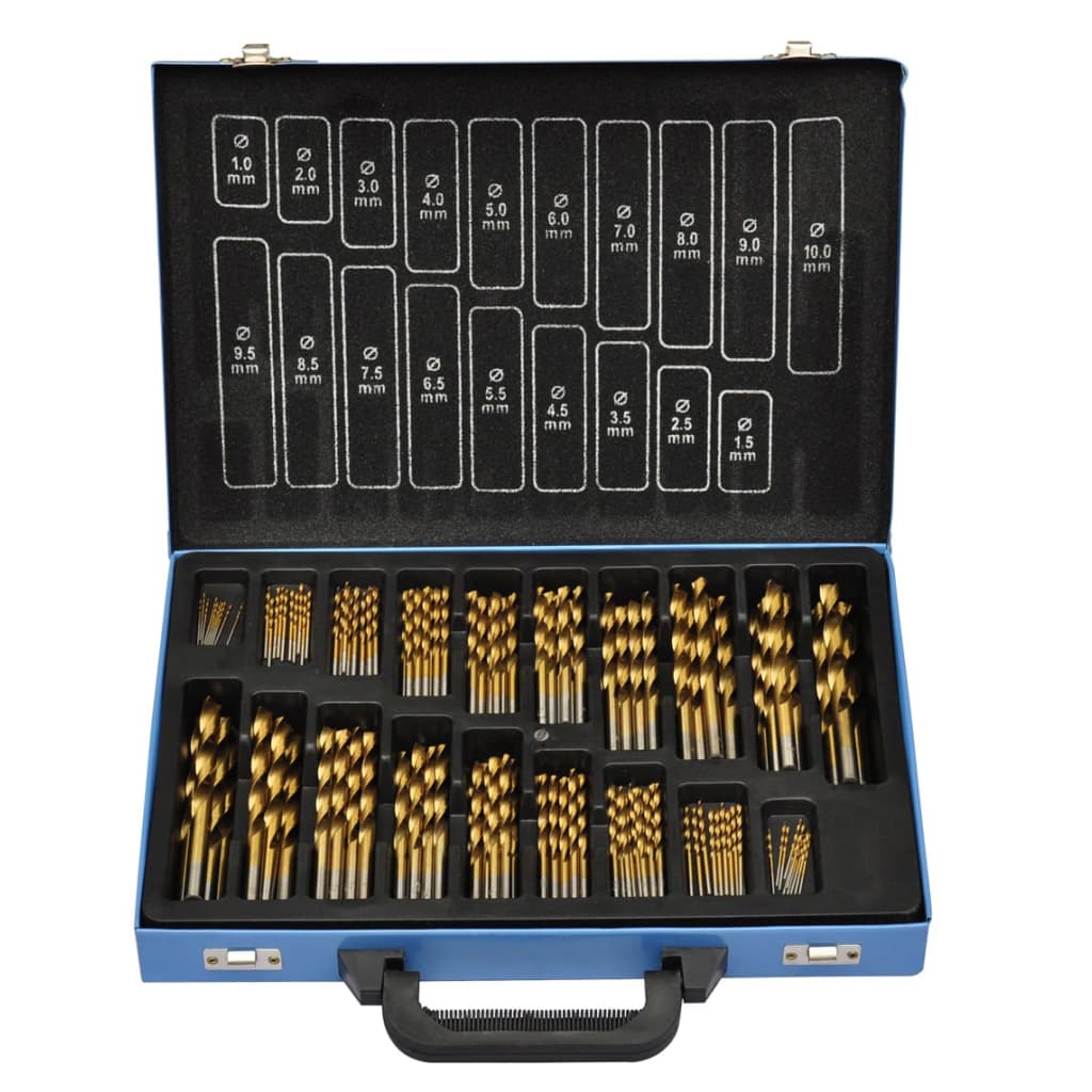 This quality tool is ideal for commercial applications in industry, crafts and workshops. It is suitable for drilling common materials with strengths of up to 900 N / mm², such as steel, cast steel, cast iron, sintered metals, nonferrous metals, plastics, soft and hardwood. An ideal match for the workshop or service vehicles. It has a titanium nitride coating, the titanium drill gives the unsurpassed wear resistance and thus an approximately 6-times longer and conventional HSS drills. The drill range comes in a sturdy metal case. The case has 2 snap fasteners made of metal and an ergonomic plastic handle. The total weight of the drill range is 3,950 g. This titanium drill bit set has a right-hand cut and a steam-annealed surface treatment. Conical: 118° Rolled type: N Cylindrical: Yes 19 different sizes 10 pcs per size: 1,0 / 1,5 / 2,0 / 2,5 / 3,0 / 3,5 / 4,0 / 4,5 / 5,0 / 5,5 / 6,0 / 6,5 / 7,0 / 7,5 / 8,0 mm 5 pcs per size: 8,5 / 9,0 / 9,5 / 10,0 mm 170 pieces of drill bits in total Kantolaukku sisältyy toimitukseen