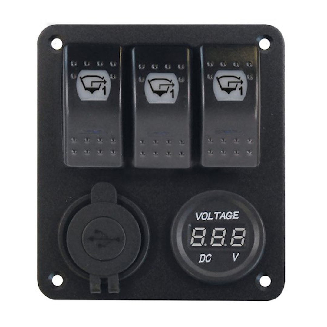 Katkaisinpaneelissa tukeva alumiininen pohjalevy, jännitemittari ja USB-ulostulo. Kolme katkaisijaa, 12 V/20A tai 24 V/10A.• Korkeus 110mm• Leveys 98mm• Asennusreikien väli korkeussuunnassa 94mm• Asennusreikien väli leveyssuunnassta 82mm