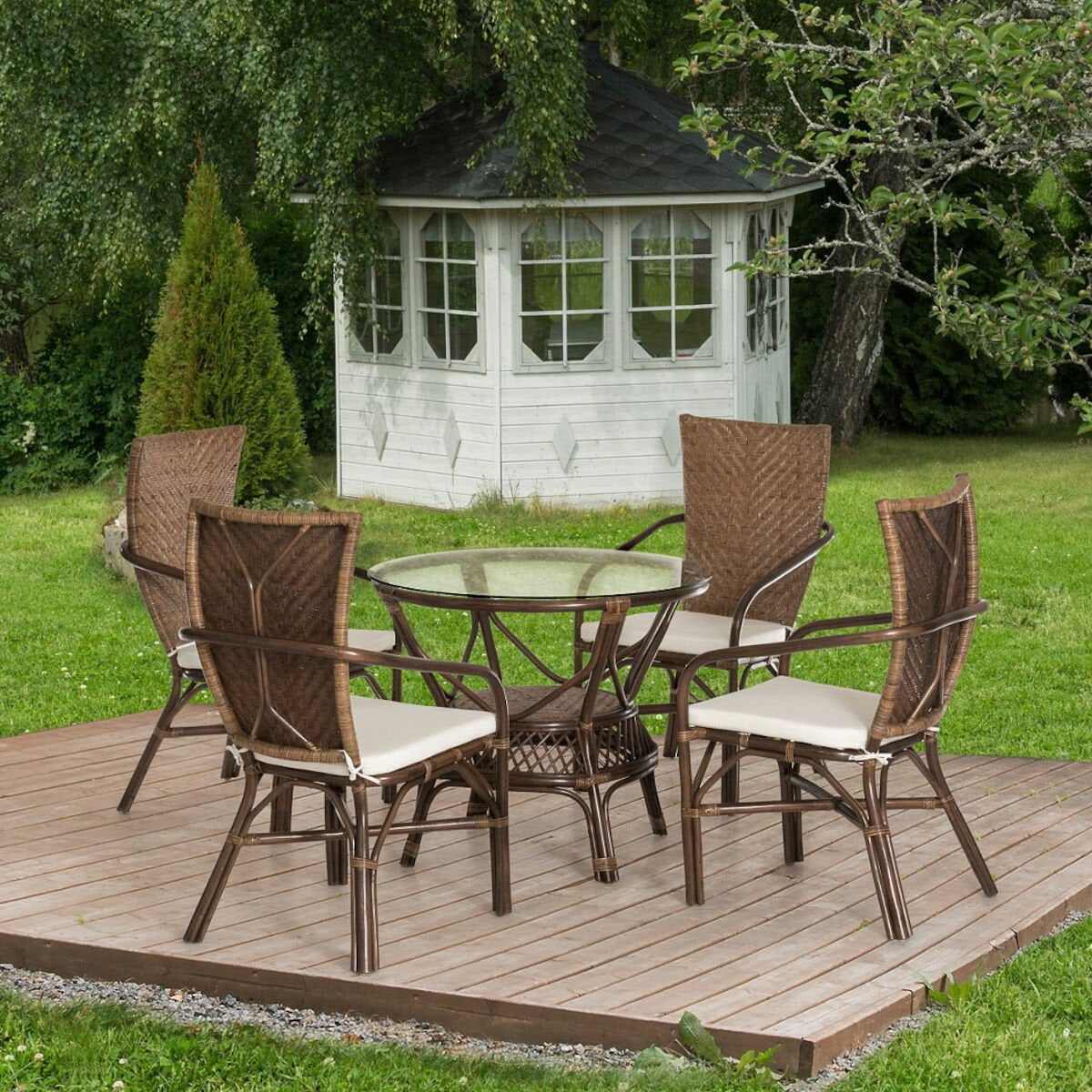 Kaunis rottinkinen ruokailuryhmä terasille. Tuoleissa korkeat selkänojat ja vaaleat istuinpehmusteet. Ruokailuryhmä sisältää kauniisti muotoillut neljä tuolia, lasikantisen pöydän ja vaaleat istuinpehmusteet. Pöydän päällä on 6 mm karkaistu lasi. Rottinkikalusteet ovat keveitä, kestäviä ja sietävät hyvin lämpötilavaihteluita, mutta kalusteen pinnalle ei saisi päästä kertymään kosteutta. Rottinkikalusteet ovat pitkäikäisiä etenkin sisätiloissa, lasitetuilla/katetuilla terasseilla ja parvekkeilla. Pöydän mitat 83 x 83 x 75 cm. Tuolin mitat: 48 x 59 x 105 cm.
