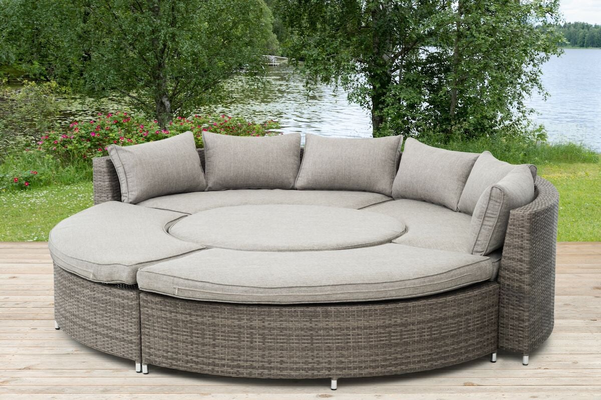 Monikäyttöisen 4Living Margo oleskeluryhmän voi kätevästi muuntaa täydelliseksi löhöilyalustaksi tai rennoksi ruokailuryhmäksi. öydässä on säätömekanismi, jolla öydän saa tarpeen mukaan joko laskettua alas tai nostettua ylös. Oleskeluryhmään sisältyy kaksi penkkiä, kaksi rahia ja öytä. Pehmusteet on verhoiltu polyesteri kankaalla. Istuin- ja selkäpehmusteet on noin 10 cm paksuja ja öydän päällä olevan pehmusteen paksuus on noin 8 cm.Penkin mitat 197 x 97 x 75 cm.Rahin mitat 172 x 78 x 38 cm.öydän mitat 120 x 120 x 68 cm (säädettävä korkeus).Ryhmän halkaisija 265 cm.