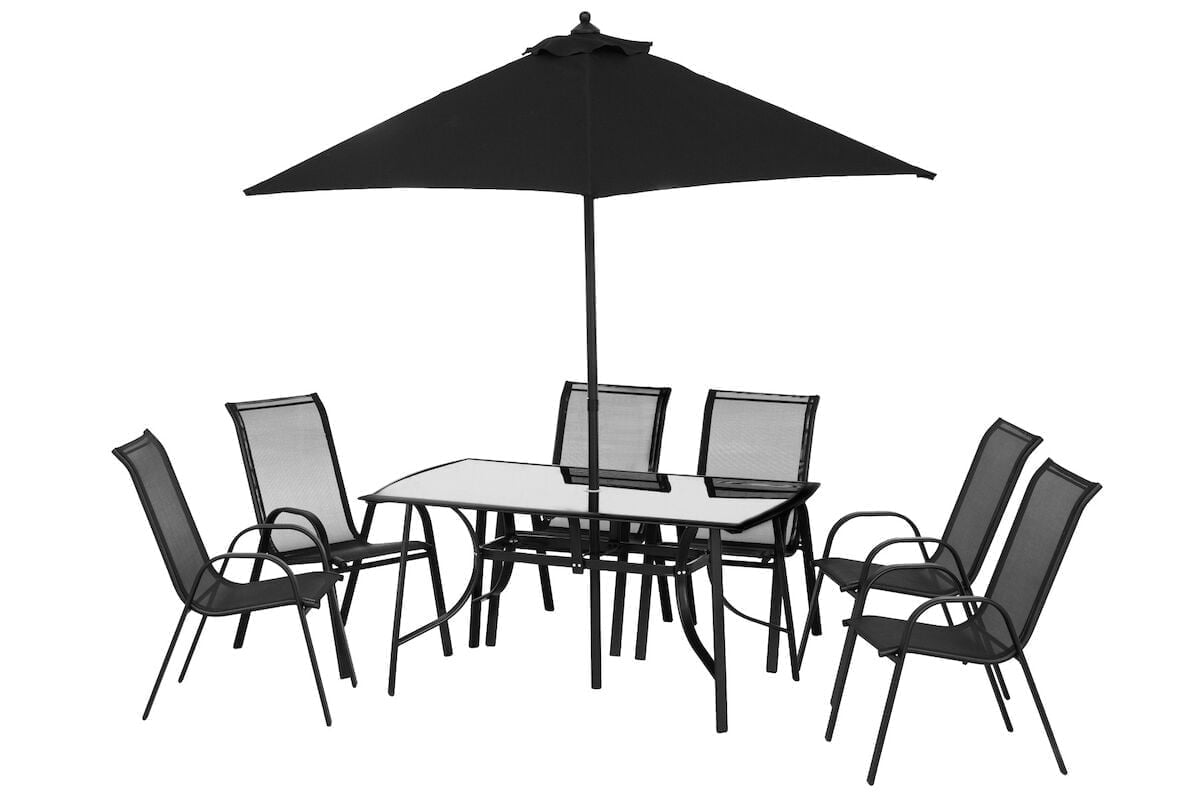 Tyylikäs 4Living Oxford 6-hengen ruokailuryhmä tuoleilla. Yhdellä kertaa kaikki tarvittava terassille. Tuolit voi tarvittaessa pinota päällekkäin. Tuolien runko on terästä, öydän runko alumiinia ja jalat terästä, varjo terästä ja varjon kangas polyesteriä. öydän lasi on musta karkaistu printattu lasi. Tuolit kestävät 150 kg. Varjon halkaisija on 2,7 m. Varjon putken halkaisija on 38 mm.