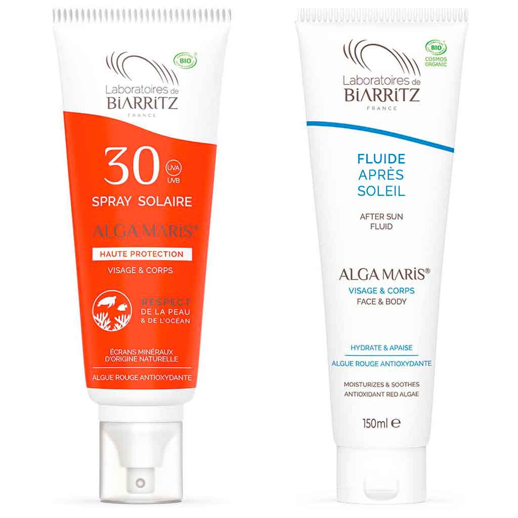 Aurinkovoidespray SPF30 ja After Sun Emulsio nyt samassa paketissa. Osta ja säästä! .Olemme paketoineet suosituimman aurinkovoiteemme ja After Sun emulsion samaan pakettiin. Sisältää aurinkovoide Spray SPF30 125ml, sekä after sun -voiteen. Aurinkovoide Spray suojaa tehokkaasti auringolta ja After Sun rauhoittaa ja uudistaa ihoa auringonoton jälkeen. Osta yhdessä ja säästä!. Alga Maris Aurinkovoide spray SPF30 : Täysin luonnollinen aurinkovoide spray suojakertoimella 30 imeytyy välittömästi, ei tahmaa eikä jätä valkoista pintaa iholle. Aurinkovoide sisältää tehokkaan suojan sekä UVA- että UVB-säteilyä vastaan. Tuoksuu ihanan kesäiseltä kookokselta! Puhdistathan aurinkovoiteen iholta huolellisesti käytön jälkeen esimerkiksi öljypohjaisella puhdistusaineella tai/ja pesukintaalla.. . Alga Maris After Sun Emulsio 150ml Alga Maris luonnollinen After Sun emulsio on kevyt ihoa kosteuttava, hoitava ja rauhoittava. After sun emulsio levittyy ja imeytyy ihanasti ja nopeasti. Emulsio on kevyt iholla, mutta arvokkaiden ja tehokkaiden raaka-aineiden ansiosta erittäin kosteuttava ja rauhoittava. Luomu aloe vera ja ruskean levän uute rauhoittaa ihoa tehokkaasti, samalla kun sheavoi antaa tehokasta kosteutusta. Sisältää runsaasti antioksidanttista patentoitua Alga-gorria yhdistettä, joka uudistaa ja suojaa ihoa auringonoton jälkeen. Alga-gorrian antioksidanttiset ominaisuudet ovat viisi kertaa tehokkaammat kuin C-vitamiinilla. .