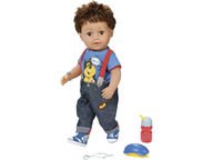 Baby Bornin isoveli valmiina leikkeihin. Baby Bornilla on nyt isoveli. Baby Born isovelinukke on kylvetettävä, ja sillä on kammattavat hiukset ja nivelletyt jalat. Nukella on söpö henkseliasu. Nukke osaa itkeä oikeita kyyneliä.