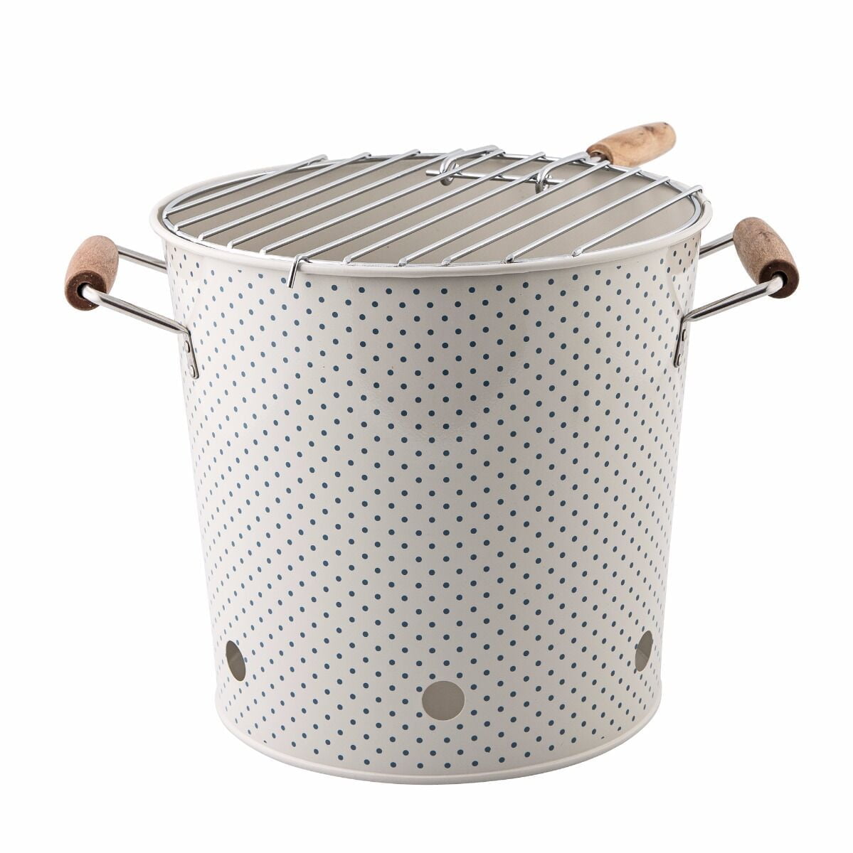 Bloomingvillen kätevä, pienikokoinen hiiligrilli. Sopii kokonsa vuoksi esimerkiksi matkalle tai retkelle mukaan. Grillissä kahvat, pilkullinen kuviointi.