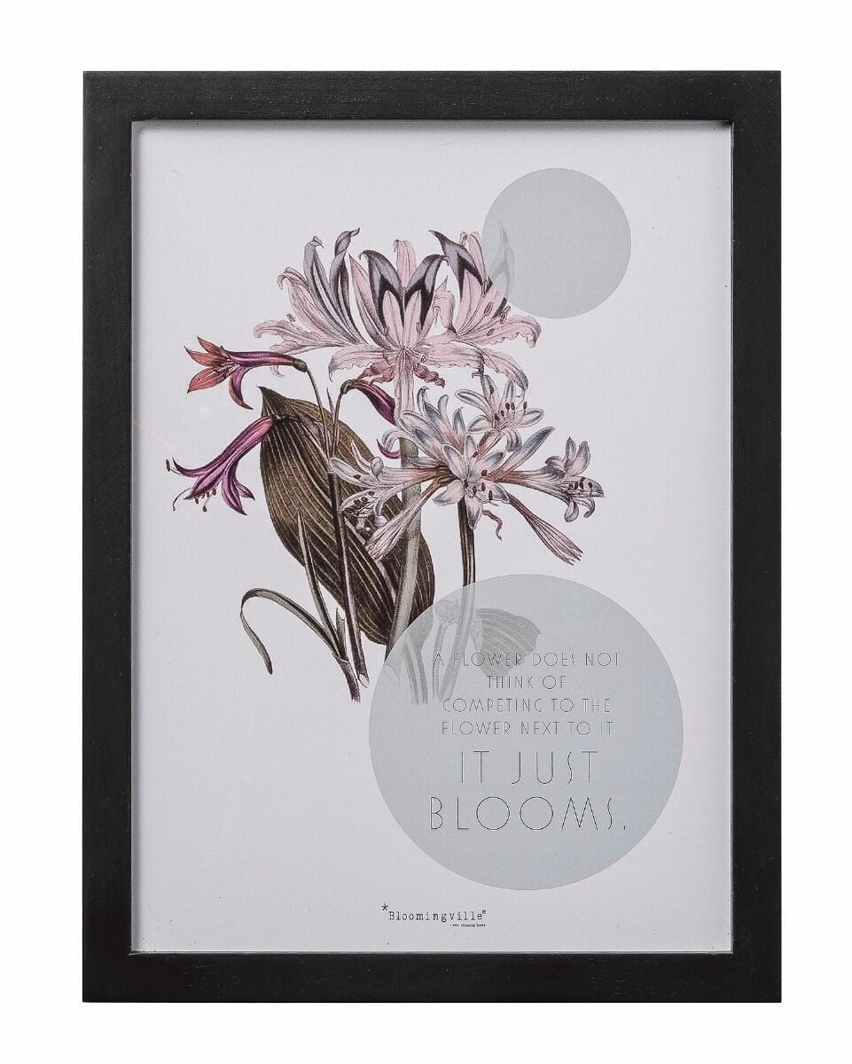 Kaunis Bloomingville kukka taulu. Kukka-aiheinen kuva yekstillä ja mustilla puukehyksillä. Kaunis ja romanttishenkinen taulu, jota mustat kehykset ryhdittävät. Taulun koko 30×40 cm.