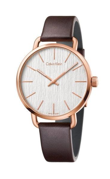 Calvin Klein -rannekello – mallinumero K7B216G6- tummanruskea nahkaranneke- mineraalilasi- kellotaulun halkaisija: 36 mm- kellotaulun väri: hopeanvaalea- rungon väri: punakulta- vesitiiviys 30 m (roiskevesitiivis)- takuu 2 vuotta- valmistettu Sveitsissä