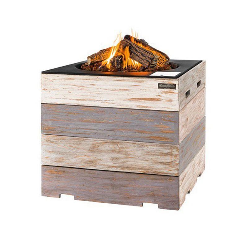 Vaaleasta tiikistä valmistetun tulisijan päällinen on musta. Tulisijassa on sähköinen sytytin, ja liekkien kokoa voidaan säätää.