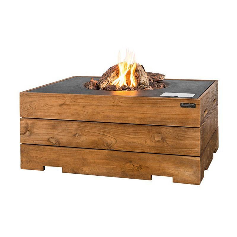 Suorakaiteen muotoinen ulkopöytä, jossa on kaasukäyttöinen tulisija tummanharmaalla kannella. Valmistettu tiikistä. Liekkien kokoa voidaan säätää tarpeen mukaan.