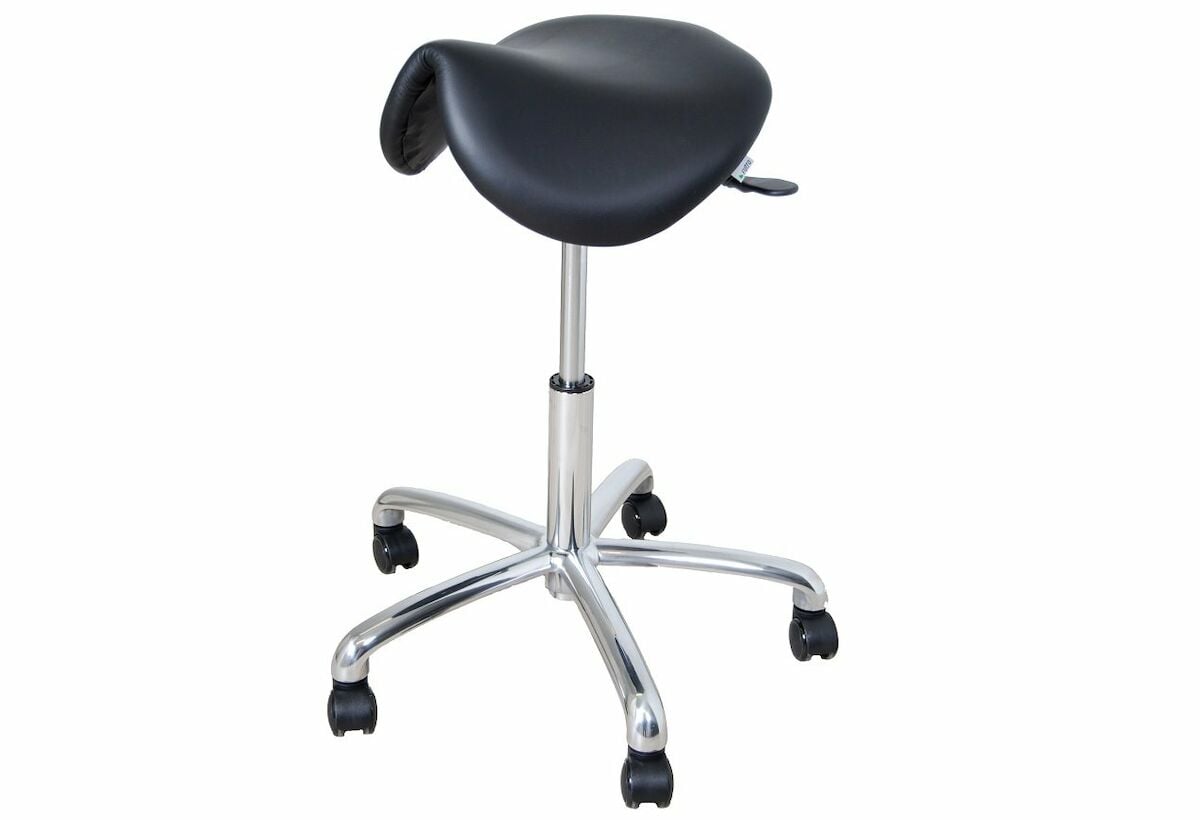 Cowboy Plus satulatuoli, jonka verhoilu on mustaa, pehmeää aniliininahkaa.Istuimen lesti on kapea, joten se soveltuu hyvin myös pienemmille henkilöille.Istuimen korkeuden ja kallistuksen säätö, korkeussäätö 52 – 72 cm. Takuu tuolissa on 2 vuotta. Tuolissa pehmeät pyörät kovalle lattialle. Vahva, metallinen ja kromattu jalkaristikko.