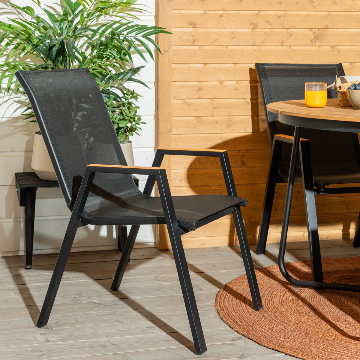 Daalia on tyylikäs ja kestävä ulkotuoli, joka sopii monenlaiseen ympäristöön. Mustaksi maalattu teräsrunko ja säänkestävä textilene-istuin tekevät tuolista huolettoman valinnan ulkokäyttöön. Textilene on joustava ja hengittävä materiaali, joka kestää hyvin kosteutta ja UV-säteilyä, säilyttäen siistin ulkonäkönsä vuodesta toiseen. Käsinojien puuta jäljittelevä pinnoite tuo ilmeeseen pehmeyttä ja luonnollista tuntua. Pinottava rakenne säästää tilaa ja helpottaa säilytystä. Ajattoman muotoilunsa ansiosta tuoli on helppo yhdistää erilaisiin ulkokalusteisiin.