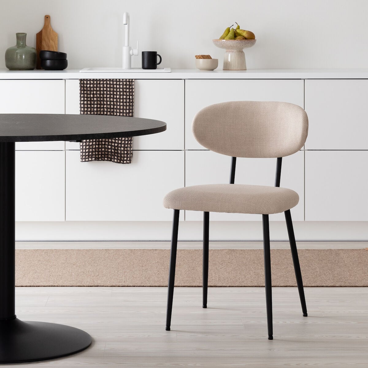Kangasverhoiltu Daniel-tuoli tuo ruokailutilaan tai olohuoneeseen harkittua muotoilua ja käyttömukavuutta. Pehmustettu istuin- ja selkäosa on verhoiltu kiinteästi laadukkaalla huonekalukankaalla, joka kestää käyttöä ja tuntuu miellyttävältä. Jos haluat hieman suuremman tuolin niin suosittelemme valitsemaan Dario tuolin. Pehmustetut ja tukevat istuinosat tekevät Danielista erinomaisen valinnan niin ruokapöydän ääreen kuin työtuoliksi kotitoimistoon. Mustat metallijalat tuovat ilmeeseen modernia kontrastia, ja muoviset tassut suojaavat lattiaa naarmuuntumiselta. Daniel sopii monien erilaisten ruokapöytien pariksi ja toimii istuimena myös kodin muissa tiloissa. Tyylikäs ja ajaton tuoli, joka yhdistää istuinmukavuuden ja selkeän muotoilun.
