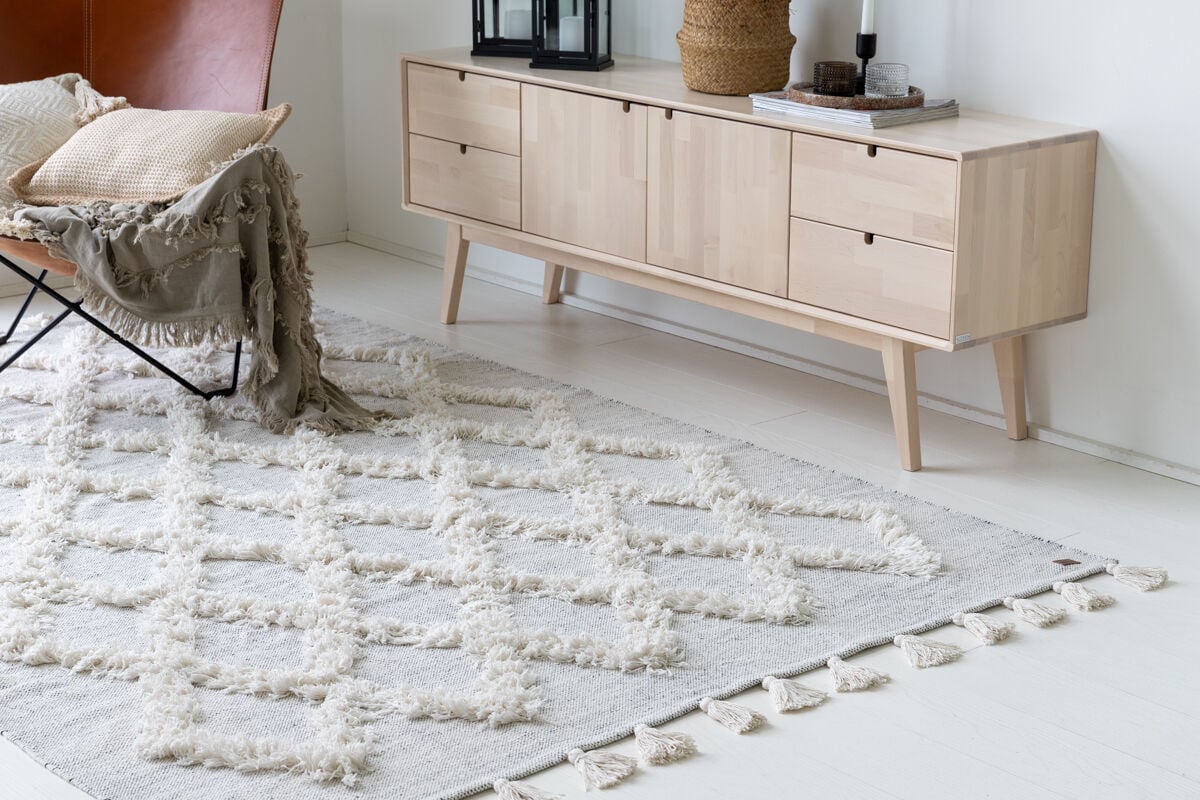 Kauniisti kuvioitu Dyyni puuvillamatto. Maton kuviointi on kohokuvioista hapsua, reunaa koristavat kauniisti solmitut tasselit. Matto on ohut ja kevyt, joten se on helppohoitoinen ja kepeä valinta. Maton alle voi lisätä liukuestepohjan, jotta se pysyy paremmin paikoillaan. Kuvan matto 160×230 cm.
