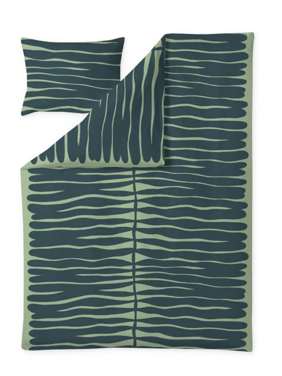 Kauniin puuvillasatiinisen Finlayson Halaus pussilakanasetin kuosin on suunnitellut Emma Hagman. Puuvillasatiinin kaunis kiilto ja sileys saadaan aikaan kankaankudonnassa käytettävällä satiinisidoksella. Säilytät kauniin kiillon ja pehmeyden pitkään, kun silität tai mankeloit lakanat pesun jälkeen. Lehtihalaus-pussilakanasetin puuvillasatiiniin lankaluku eli kankaan tiheys (TC) on erittäin korkea, 288 TC. Mitä suurempi lankaluku, sitä tiiviimpi kangas. Puuvillasatiini tuntuu miellyttävältä ihoa vasten.Pussilakanan yläosassa on käsiaukot, jotka helpottavat peiton pujottamista pussilakanan sisään. Tässä pussilakanasetissä on käytetty ainoastaan luomupuuvillaa.
