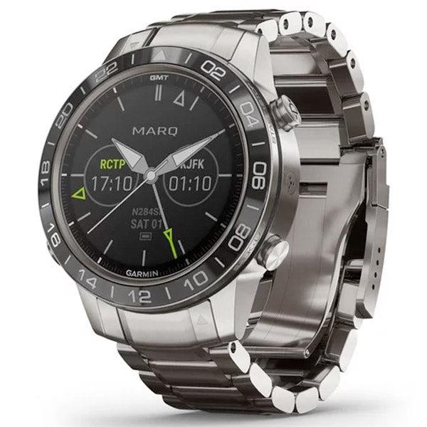 Garmin MARQ™ Aviator moderni älykello Kohoa korkeuksiin. MARQ Aviator on ylellinen moderni kello, joka kuvastaa lentämisen riemua ja ohjaa sinua kaikkialla, minne ikinä elämä sinut johdattaakin. Lähdön hetkellä se näyttää, minne olet matkalla. Matkan aikana se ilmoittaa, milloin olet perillä. Seuraa matkantekoa kiillotetusta 24-tuntisesta GMT-kehyksestä, paikallisen ajan ja kahden muun lentokentän aikavyöhykkeen näytöstä. Ilmailuhenkinen titaanista valmistettu ranneke pysyy tukevasti paikoillaan hurjimmassakin menossa. Suoraan lähimmällä kentälle: hätätilannenavigoinnin näppäin aktivoi nopeasti reitin lähimmälle lentokentälle. Liikkuva kartta: seuraa lentoreittiäsi suhteessa lähellä oleviin suuntimalaitteisiin, lentokenttiin, muihin reitteihin, täysvärisellä liikkuvalla kartalla. HSI-suuntaneula: seuraa HSI-suuntaneulaa kohteeseen. ClimbPro-noususuunnittelun avulla näet reaaliaikaiset tiedot tämänhetkisistä ja tulevista nousuistasi, kuten kaltevuuden, etäisyyden ja nousun. Säätiedotukset: katso ilmailusää, kuten tuulet, näkyvyys ja ilmanpaine, sekä NEXRAD-säätutka reittiäsi varten. Lentojen kirjaaminen: aloita lennon kirjaaminen automaattisesti lähdön yhteydessä ja siirrä sitten päivämäärä, kesto, lentoaika ja reitti flyGarmin.com®- ja Garmin Pilot™ -sovelluksiin Älykkäät ilmoitukset: saat sähköpostit, tekstiviestit ja hälytykset suoraan kelloon, kun se on pariliitetty yhteensopivaan laitteeseen. Musiikkisovellukset: voit tallentaa jopa 2 000 kappaletta tai käyttää esiladattuja suoratoistomusiikkisovelluksia yhteensopivista palveluista, joita ovat esimerkiksi Spotify® ja Deezer, ja kuunnella kuulokkeilla Bluetooth®-tekniikan avulla. Garmin Pay -lähimaksu: kassalla maksaminen on nopeaa, kun käytät Garmin Pay™ -lähimaksuratkaisua jota palveluntarjoajat tukevat. Stressitaso: seuraa sykevaihtelua stressitason laskemista varten. Sovellukset ja suoritukset: esiladatut suosikkisovellukset ja suoritusprofiilit ovat saatavilla juoksua, pyöräilyä, golfia, uintia, patikointia, soutua, hiihtoa ja muita lajeja varten. Pulse Ox: katso pulssioksimetristä, kuinka hyvin kehosi happisaturaatio mukautuu korkean paikan ohuempaan ilmaan. ClimbPro: ClimbPro-noususuunnittelun avulla näet reaaliaikaiset tiedot tämänhetkisistä ja tulevista nousuistasi, kuten kaltevuuden, etäisyyden ja nousun. Useita GNSS-järjestelmiä: käyttämällä useaa maailmanlaajuista satelliittijärjestelmää (GPS, GLONASS ja Galileo) paikannus sujuu myös haastavammissa ympäristöissä kuin pelkän GPS-järjestelmän avulla. ABC-anturit: navigoi seuraava reittisi ABC-antureilla, joihin kuuluvat korkeusmittari, ilmanpainemittari sään seurantaan ja kolmiakselinen sähköinen kompassi. TOPO- ja hiihtokartat: suuntaa ulkoilemaan, ota mukaan esiladatut topografiset kartat ja katso 2 000 hiihtokeskuksen rinteiden nimet ja vaikeusasteet eri puolilta maailmaa. Golfkentät: käytä yli 41 000 golfkentän täysvärisiä CourseView-karttoja eri puolilta maailmaa, painikekohdistusta ja Playslike-etäisyyttä. Connect IQ: voit ladata mukautettuja kellotauluja, lisätä tietokenttiä ja hankkia sovelluksia ja widgetejä Connect IQ™ -kaupasta. Akku: ladattavan litiumakun kesto on jopa 12 päivää älykellotilassa, 28 tuntia GPS-tilassa, 48 tuntia UltraTrac™-tilassa ja 9 tuntia GPS-tilassa, musiikkiominaisuus aktivoituna. Tekniset tiedot Linssin materiaali: kupumainen safiirikristalliKehyksen ja kotelon materiaali: titaani/keraaminenRungon väri: kromiQuickFit-kellohihnat : kyllä Rannekkeen materiaali: titaaniRungon koko: 46 x 14,7 mmNäytön koko: 30,4 mmPaino: 144 g (95 g silikonikumisena)Vesitiiveys: 100 m (10 atm), uintitiivisNäytön tyyppi: auringonpaisteessakin luettava, transflektiivinen MIP (memory-in-pixel)Näytön tarkkuus: 240 x 240 kuvapistettäAkun kesto: älytila: enintään 12 päivää, GPS-tila: enintään 28 tuntia, GPS ja musiikki: enintään 9 tuntia, UltraTrack -tila: enintään 48 tuntiaMuisti: 32 GtTuotenumero: 010-02006-05 Kellotoiminnot:aika/päiväys, GPS-aikasynkronointi, automaattinen kesäaika, herätyskello, ajastin, sekuntikello, auringonnousu- ja -laskuajatAnturit:GPS, Glonass, Galileo, Garmin Elevate -rannesykemittari, barometrinen korkeusmittari, kompassi, kiihtyvyysmittari, lämpömittari, gyroskooppi, pulssioksimetrin akklimatisaatio Päivittäiset älyominaisuudetBluetooth, ANT, Wifi, Connect IQ, tekstiviestin vastaanotto / puhelun hylkäys, älykkäät ilmoitukset, kalenteri, sää, puhelimen etsiminen, musiikin hallinta, etsi kello -toiminto, VIRB-etäkäyttö, yhteensopiva Garmin Connect Mobilen kanssa, Iphone- ja Android-yhteensopivuus, Garmin PayTurvallisuus- ja jäljitysominaisuudet:LiveTrack, Group LiveTrack, Reaaliaikainen tapahtumien jakaminenIlmailutoiminnot:- Maailmanlaajuiset lentokenttätietokannat- Korkeusmittari, jossa säädettävä ilmanpainemittarin asetus- Kolmiakselinen kompassi ja HSI- Useita aikavyöhykkeitä ja Zulu/UTC- Vastaanota lentosuunnitelmia langattomasti Garmin Pilot -sovelluksesta- NEXRAD liikkuvalla kartalla- Liikkuva kartta ja ilmailun reittipisteet- Reittipistetietosivu- Maailmanlaajuiset NAVAID- ja risteystietokannat- Connext avionics connectivity- In-flight Pulse OxAktiivisuuden seurantaominaisuudet:askellaskuri, liikkumispalkki (näkyy laitteessa, kun olet ollut tietyn ajan paikallasi. Palkki nollataan kävelemällä muutaman minuutin ajan), automaattinen tavoite (oppii aktiivisuustasosi ja määrittää päivittäisen askeltavoitteen), levon seuranta (seuraa unen kokonaismäärää, liikejaksoja ja levollisen unen jaksoja), kulutetut kalorit, kiivetyt kerrokset, kuljettu matka, tehominuutit, TrueUp, Move IQ, koko päivän stressiseuranta, kuntoikä, Body Battery -energianseurantaGym & Fitness / salitreeniominaisuudet:- käytettävissä olevat kuntosalin suoritusprofiilit (voimaharjoittelu, kardio, crosstrainer, portaiden nousu, kerrosten kiipeäminen, sisäsoutu ja jooga)- card