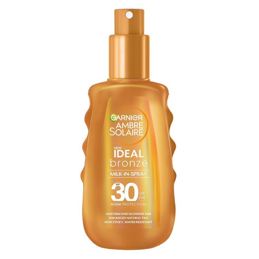 Garnierin Ambre Solaire Ideal Bronze Milk in Spray SPF 30 on aurinkosuihke sinulle, joka haluat tasaisen värin ja upeaa hehkua.