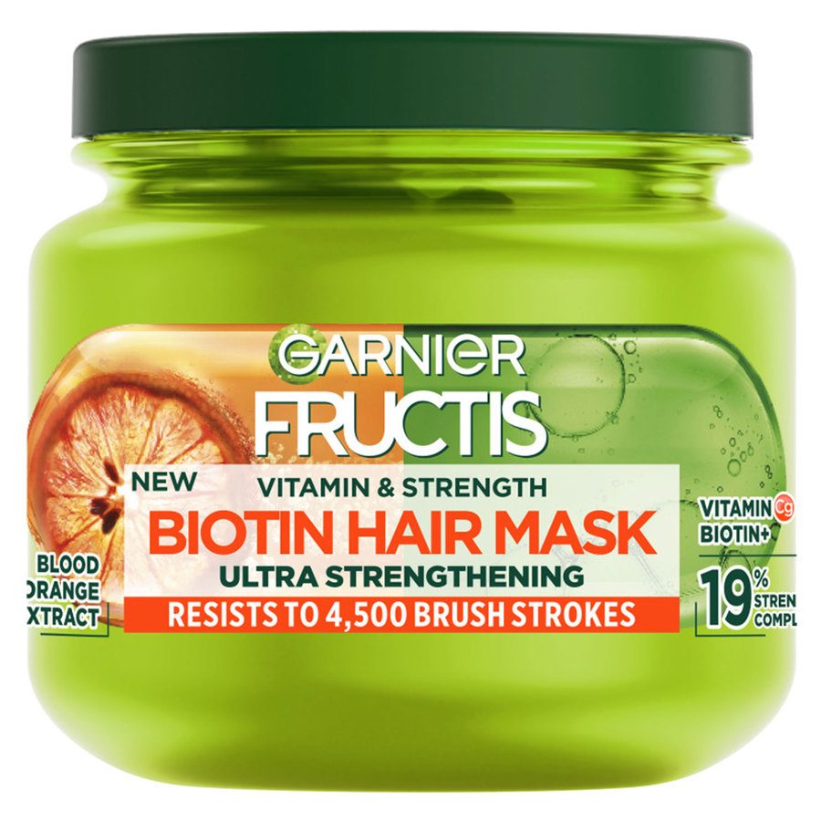 Garnierin Fructis Vitamin & Strength Biotin Hair Mask -hiusnaamio vahvistaa hiuksia ja tekee niistä vastustuskykyiset jopa 4 500 harjausliikkeelle* vähentäen siten hiusten katkeilua.