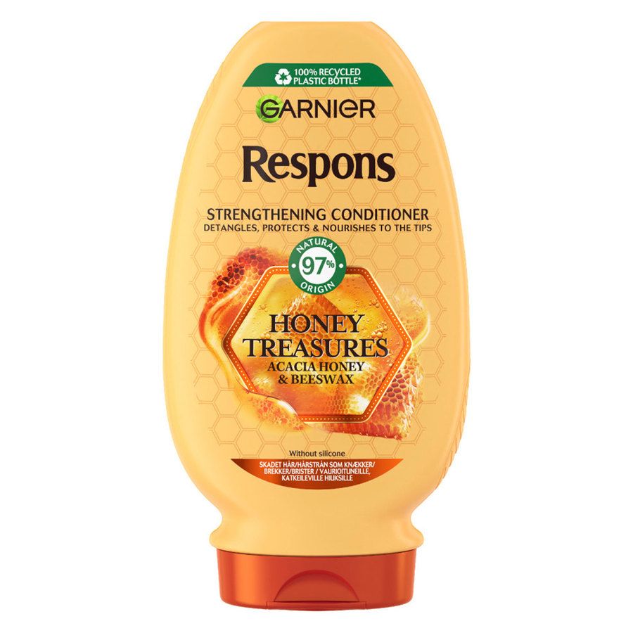 Garnierin Respons Honey Treasures Conditioner -hoitoaine sisältää 97-prosenttisesti luonnollista alkuperää olevia ainesosia.