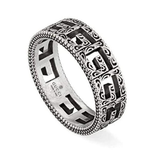 Gucci G Cube -sormus patinoitua hopeaa Gucci G Cube sormus on G:n muotoisin aukoin koristeltu. Sormus on patinoitua hopeaa. Sormuksen koko on 19 mm. Italialainen Gucci valmistaa maailmanlaajuisesti tunnettujen vaatteiden ohella myös ylellisiä koruja ja kelloja. Guccin kelloissa ja koruissa yhdistyy ajattomuus, laatu ja omaleimainen tyyli. Tuotenumero: 086YBC551918001019Sormuksen materiaali: hopea, patinoituSormuksen koko: 19 mm Katso kaikki Gucci-kellot ja -korut täältä
