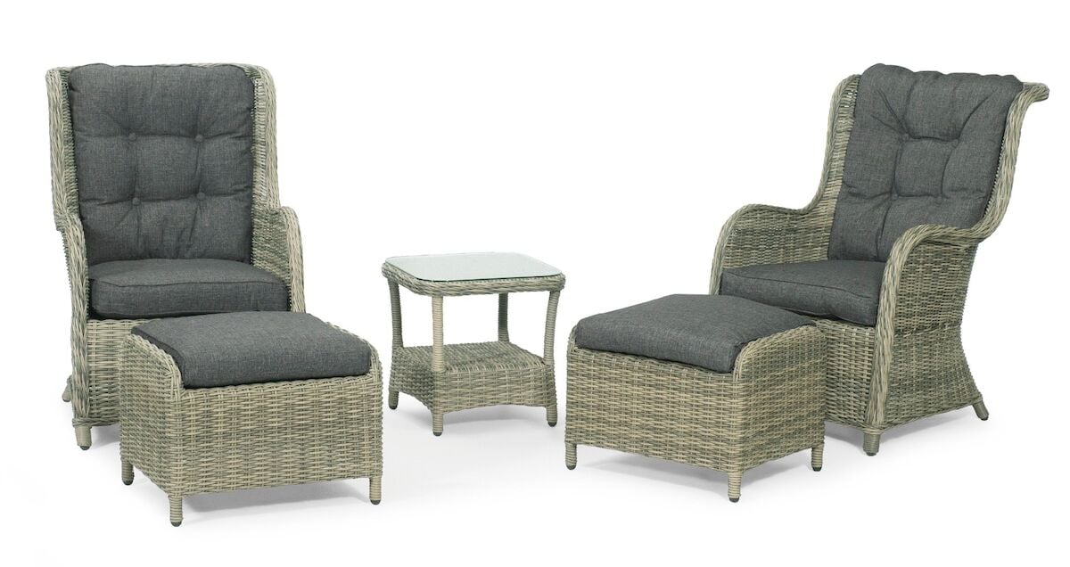 Täydellinen Hillerstorp Hampton oleskeluryhmä, joka sisältää kaksi nojatuolia ja rahia sekä pienen öydän. Materiaalina polyrottinki, väri harmaanrusehtava. Muhkeat pehmusteet, joiden paksuus on noin 9 cm. Pehmusteiden väri harmaa.