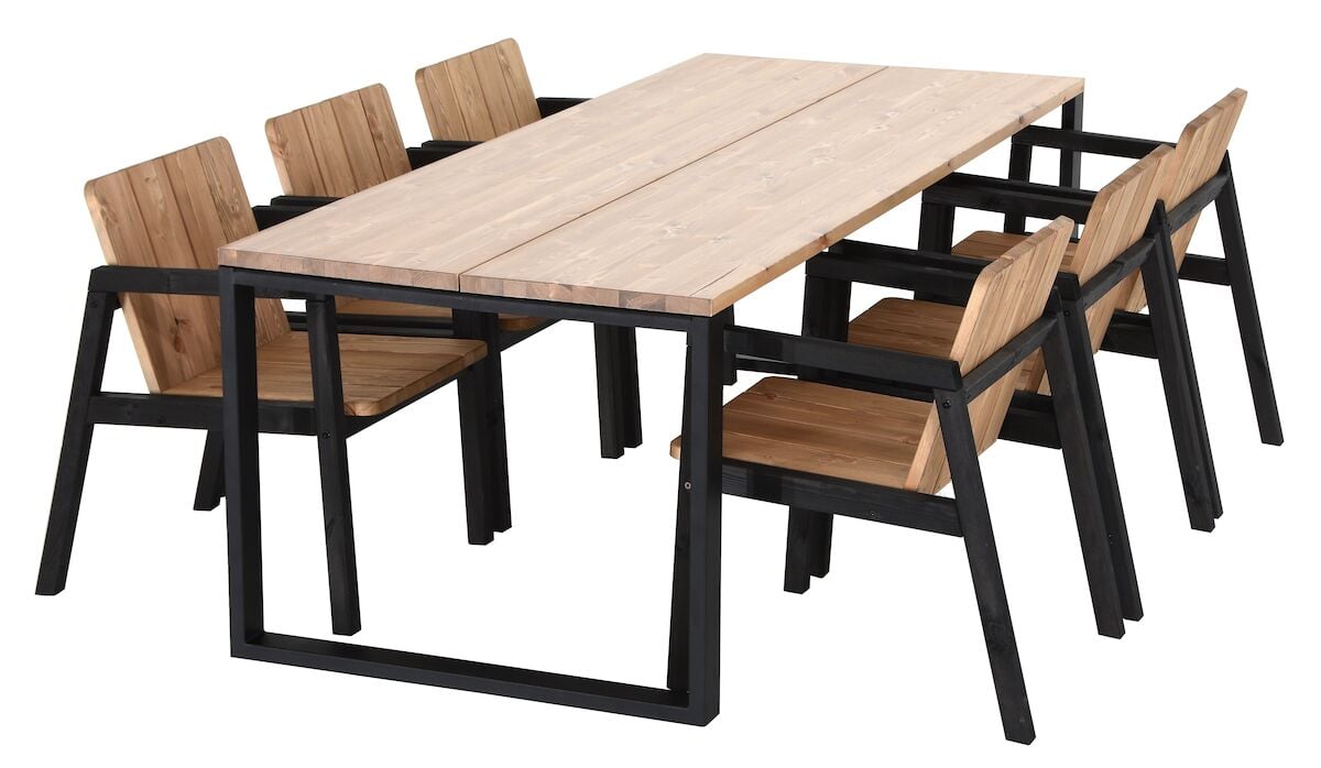 Tyylikäs 6-hengen ruokailuryhmä, joka sopii niin sisätiloihin kuin uloskin. Ryhmään kuuluu mäntyinen tyylikäs 6-hengen ruokaöytä metallijaloilla ja kuusi Juho Pasilan Vekelle suunnittelemaa upeaa Kalho puutarhatuolia. Kalho puutarhatuoleilla on Design From Finland -sertifikaatti. öydän kansi on tehty kahdesta leveästä liimapuulankusta, jonka liimauksessa on käytetty vedenkestävää liimaa. Tukevat metalliset öydän jalat tuovat ilmettä ryhmään. Jalat ovat jauhelakatut ja ne voidaan asentaa kahteen eri kohtaan, joko aivan öydän päätyyn tai hieman sisemmäs.Lisätietoa materiaalista: Honka-öydässä käytettävä lankku on oksaista mäntyä, jossa sallitaan luonnollisia halkeamia, oksanreikiä, pihkasta ja puunytimestä syntyneitä uria. öydän lankkua on vanhennettu koneellisesti harjaama…