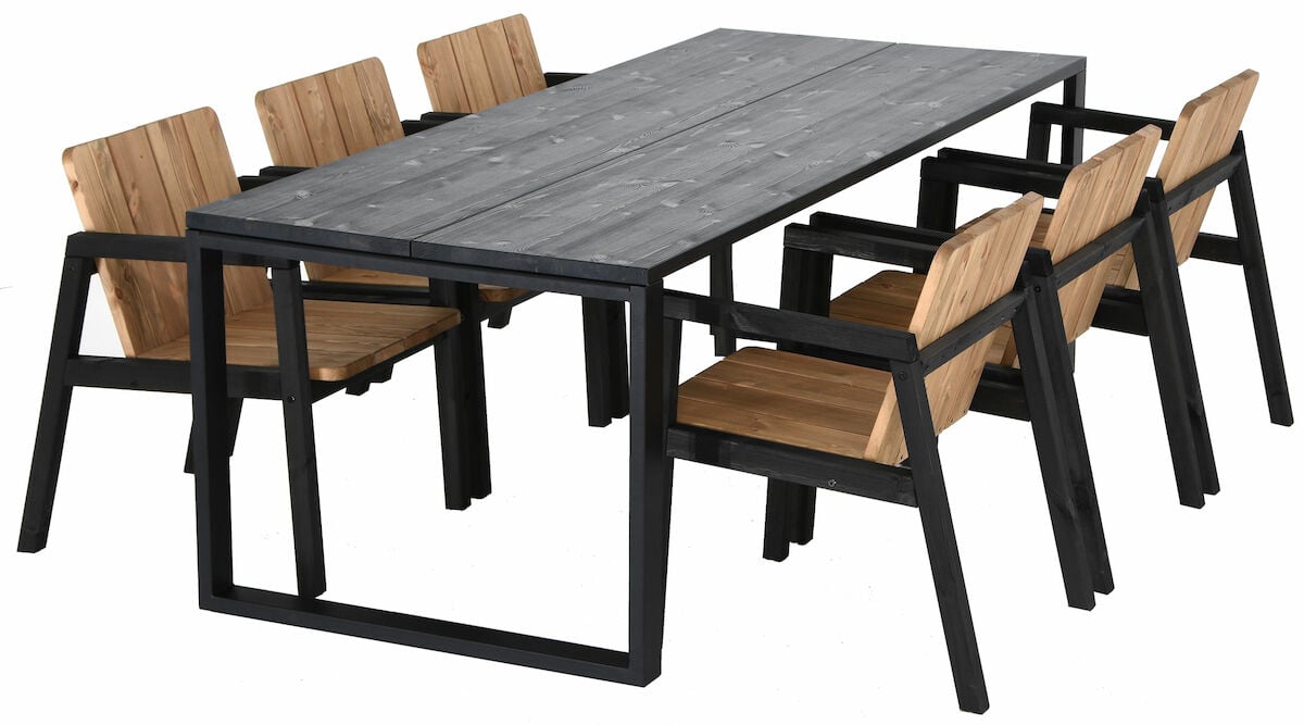 Tyylikäs 6-hengen ruokailuryhmä, joka sopii niin sisätiloihin kuin uloskin. Ryhmään kuuluu mäntyinen tyylikäs 6-hengen ruokaöytä metallijaloilla ja kuusi Juho Pasilan Vekelle suunnittelemaa upeaa Kalho puutarhatuolia. Kalho puutarhatuoleilla on Design From Finland -sertifikaatti. öydän kansi on tehty kahdesta leveästä liimapuulankusta, jonka liimauksessa on käytetty vedenkestävää liimaa. Tukevat metalliset öydän jalat tuovat ilmettä ryhmään. Jalat ovat jauhelakatut ja ne voidaan asentaa kahteen eri kohtaan, joko aivan öydän päätyyn tai hieman sisemmäs.Lisätietoa materiaalista: Honka-öydässä käytettävä lankku on oksaista mäntyä, jossa sallitaan luonnollisia halkeamia, oksanreikiä, pihkasta ja puunytimestä syntyneitä uria. öydän lankkua on vanhennettu koneellisesti harjaama…