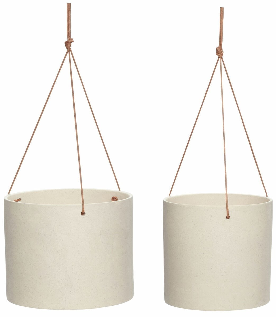 Hübsch Aero roikkuvat kukkaruukku setti sisältää 2 kpl keraamisia ruukkuja, jotka voi laittaa roikkumaan pakettiin kuuluvilla nahkaremmeillä. Ruukuissa on kaunis sävy ja moderni ilme. Ruukkujen sävy voi vaihdella hieman. Ruukut sopivat hyvin myös katettuun ulkotilaan, mutta ne eivät kestä pakkasta. Roikkuvien ruukkujen etu on se, että ne saa ripustettua juuri siihen kohtaan asuntoa kun haluaa, eivätkä ole riippuvaisia senkeistä tai muista huonekaluista. Veken valikoimasta löytää runsaasti myös tekokasveja, jotka tuovat vihreyttä, mutta eivät vaadi huolenpitoa. Ruukut ovat erikokoiset ja pienemmän halkaisija on 17 cm ja isomman 20 cm. Ruukut ovat saman korkuisia. Ruukuille kannattaa käyttää suojaruukkuja.