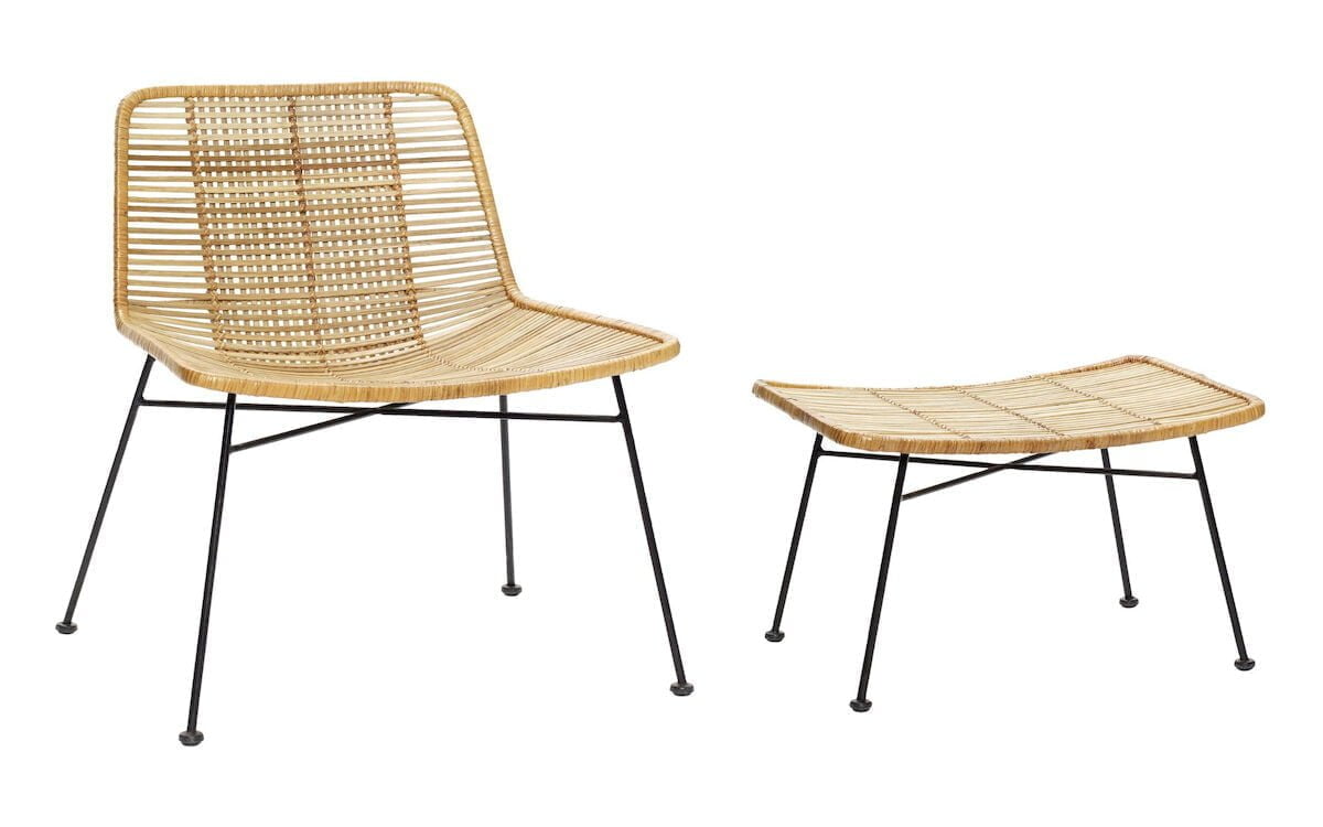 Ihana ja kepeä Hübsch rottinkituoli jonka runko on kestävää metallia jotka eivät naarmuta lattiaa. Kaveriksi talja tai huopa sekä hyvä kirja! Materiaalinsa ansiosta soveltuu hienosti myös vaikka pukuhuoneeseen saunan jälkeiseen rentoutumiseen. Tuolin mitat: L61 x S62 x H71,  rahin mitat: L61 x S43 x H37cm.