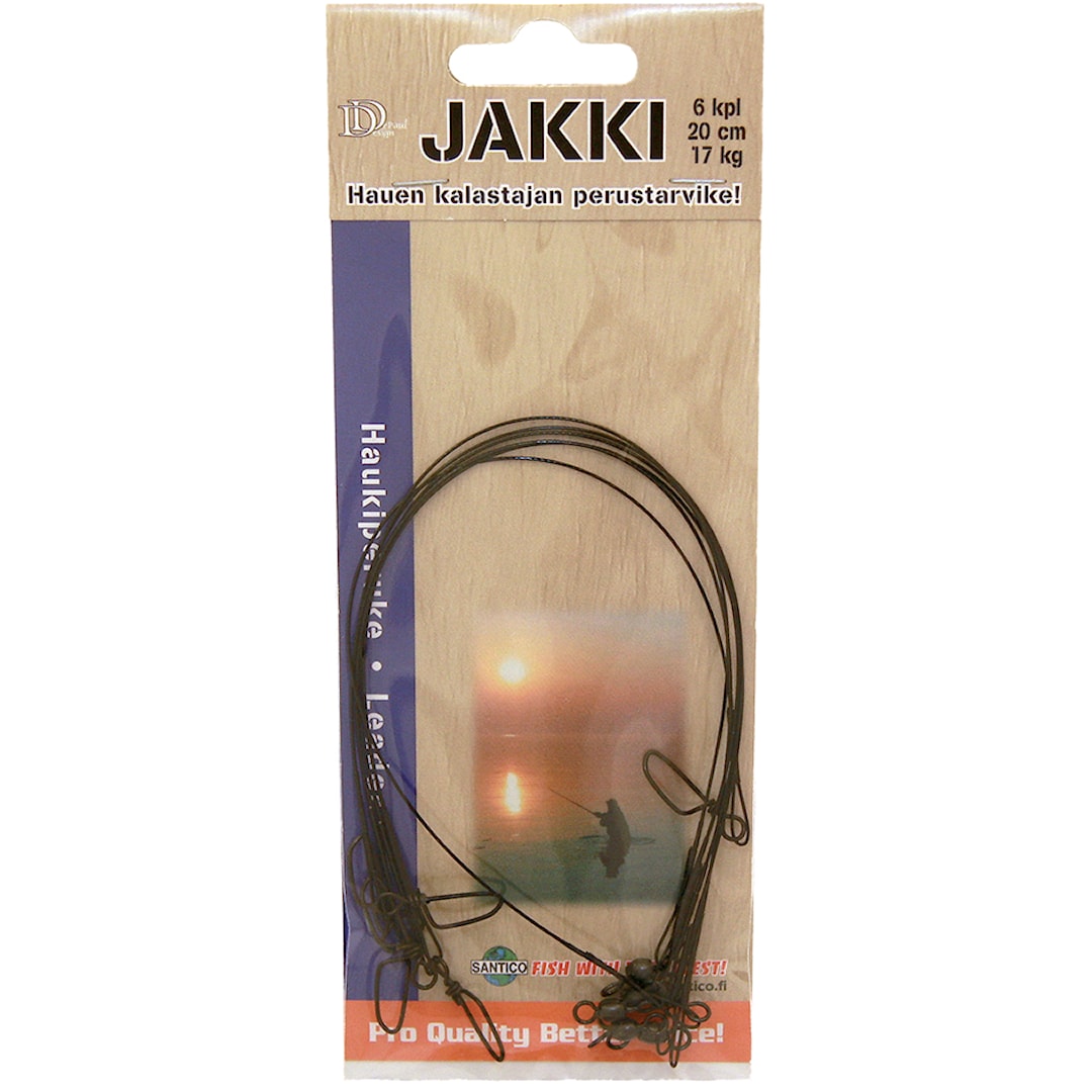 Jakki vaijeriperuke tosi kalastukseen. Päällystetty vaijeriperuke on kestävä vaihtoehto hauen kalastukseen, jolla vältyt siiman poikki menemiseltä. Perukkeen pituus 20 cm. Paketissa 6 kappaletta vaijeriperukkeita.