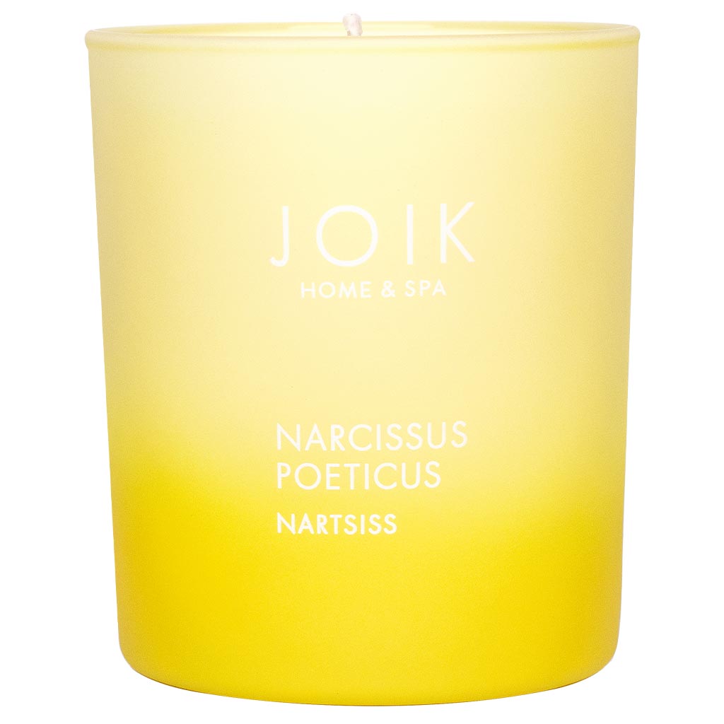 Keltainen kuin kevät, Narcissus Poeticus hurmaa raikkaalla narsissien tuoksulla .JOIK Home & SPA Tuoksukynttilä Narcissus Poeticus on keltainen kuin kevät. Narcissus Poeticus hurmaa raikkaalla narsissien tuoksulla ja tuo piristystä piteneviin kevätpäiviin. Täyteläisen kukkainen tuoksu muistuttaa aurinkoisista päivistä ja kukkaan puhkeavasta luonnosta. Moniulotteinen tuoksu sisältää vivahteita narsisseista, hyasintista, jasmiinista, vihreistä lehdistä ja aamukasteen raikastamasta nurmesta. . JOIK Home & SPA kynttilöiden vaha on valmistettu ruotsalaisesta rapsista, joka on biohajoavaa ja palaa pidempään ja puhtaammin kuin parafiini. JOIK:n kynttilät ovat vegaanisia. Kynttilöiden tuoksut ovat synteettisiä. JOIK käyttää Home & SPA -linjansa kynttilöissä luonnollisen kasvivahapohjan kaverina laadukkaita kosmetiikkalaatuisia synteettisiä tuoksuja, sillä ne ovat tasalaatuisia ja säilyvät kynttilässä paremmin kuin luonnolliset, helposti haihtuvat tuoksut. Näistä synteettisistä tuoksukomponenteista on myös mahdollista kehitellä huumaavia komboja; sellaisiakin, joita ei luonnollisista tuoksuista ole mahdollista valmistaa.. . JOIK Home & SPA tuoksukynttilä käyttöohje Ensimmäisellä kerralla polta kynttilää noin tunnin, kunnes sulanut vaha saavuttaa lasin reunat. Tämä varmistaa, että kynttilä palaa tasaisesti. Jatkossa suosittelemme polttamaan kynttilää 1-3 tuntia kerrallaan. Tällä tavoin kynttilä palaa tasaisesti täydet 30 tuntia. .