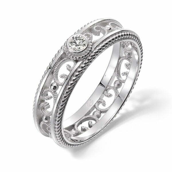 Valkokultainen Kalevala Filigraani-sormus 0,06 ct timantilla ja 5 mm leveällä rungolla Kalevala Love -malliston valkokultaisen Filigraani-sormuksen pitsimäinen kuvio ihastuttaa vuosikymmenestä ja jopa vuosisadasta toiseen. Tässä Filigraani-sormuksessa on 5 mm leveä runko ja siihen on istutettu taiten hiottu 0,06 karaatin painoinen timantti. Filigraanikorut edustavat 1700-luvun varakkaan vallasväen käyttämää tyyliä. Tällaiset filigraanikoristeiset korut olivat tuolloin yleisiä Ruotsissa ja sieltä niitä kulkeutui myös Länsi-Suomen rannikkokaupunkeihin. Myös tämän sormuksen esikuva on 1700-luvulta peräisin oleva museomalli. Filigraani on vanha kultasepän tekniikka, jossa ohuita lankoja juotetaan kehykseen. Näin saadaan aikaan sen herkkä ja pitsimäinen kuvio. Sormuksen pohjalta suunniteltuja koruja on ollut Kalevala-mallistossa jo 1960-luvulta lähtien. Love on Kalevalan mallisto, joka kuvastaa Kalevalan omintakeista muotoilua ja vahvaa tarinallisuutta. Love-malliston sormukset on valmistettu 14 karaatin kullasta, joka on 100 prosenttisesti kierrätettyä. Malliston briljanttihiotut timantit ovat korkealaatuista H / VS1 -luokkaa. Huomioithan, että kyseessä on tilaustuote, jonka toimitusaika on noin kaksi viikkoa. Materiaali: 14K valkokultaPaino: 5 gRungon leveys: 5 mmRungon paksuus: 1,6 mmTimantti: 0,06 ctTuotekoodi: 541000501D Katso kaikki Kalevala-korut täältä