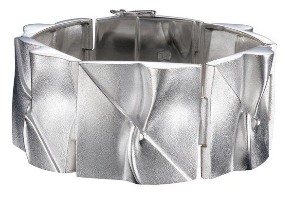 Kalevala Kuunsilta rannekoru, Art by Kalevala Korun materiaali: hopeaPituus: 18,5 cm Muotoilija: Björn Weckström Koru koostuu mattahohtoisen hopeisista paloista, joissa elävä, kuvioitu pinta. Rannekorussa on kotelolukko. Jylhänkaunis Kuunsilta-rannekoru on upea osa veistoksellista Art by Kalevala-mallistoa. Rannekoru kuuluu Space Silver-sarjaan, joka on saanut innoituksensa ihmiskunnan saavutuksista avaruudessa vuonna 1969. Neil Armstrong ensimmäisenä kuun päällä kävelleenä ihmisenä sekä tapahtumien synnyttämä innostus ja riemu vaikuttivat syvästi muotoilijaan, joka loi Space Silver-sarjan. Muut Art by Kalevala-malliston korut löydät täältä: https://laatukoru.fi/collections/kalevala-korut/mallisto-art-by-kalevala