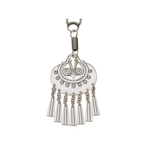 Kalevala Koru tuo 800-1050 -luvun viikinkiajan upean koruaarteiston tämän päivän ihmisen ulottuville. Viikingit poikkesivat idän kauppamatkallaan Suomen rannikolle ja vaihtoivat turkiksiin mm. aseita ja koruja. Näiden eri puolilta maailmaa peräisin olleiden korujen innoittamana suomalaiset korusepät tekivät uusia koruja, jotka yllättäen saivat selvästi omaperäisen, suomalaisen muodon. Silloin syntyneet korut ovat puolestaan innoittaneet myöhempiäkin koruseppiä suunnittelemaan koruja, jotka ovat hengeltään selvästi viikinkiaikaisia. Germund Paaer, Kuuttaren luoja, suunnitteli monia kauniita viikinkiaiheisia koruja.Design: Germund PaaerPituus: 70 cmPaino: 35 gKorkeus: 105 mmMateriaali: hopeaTuotekoodi: 2203030