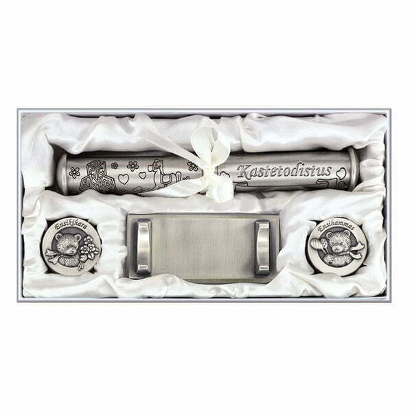 Kastetodistusputki jalustalla sekä ensikihara- ja ensihammasrasioilla Tässä kauniissa lahjasetissä on kastetodistusputki, ensikihararasia ja ensihammasrasia. Kastetodistusputken mukana tulee jalusta, jolloin sen voi asettaa hyllyyn koristeeksi. Tuotteet toimitetaan vuoratussa lahjapakkauksessa ja niihin saa halutessaan kaiverruksen. Tuotteeseen voidaan kaivertaa nimi ja muut tiedot (mikäli halutaan), kuten syntymäpäivä, paino ja pituus. Materiaali: metalliseosTuotenumero: 078746Suomenkielinen. Katso kaikki kastelahjat täältä