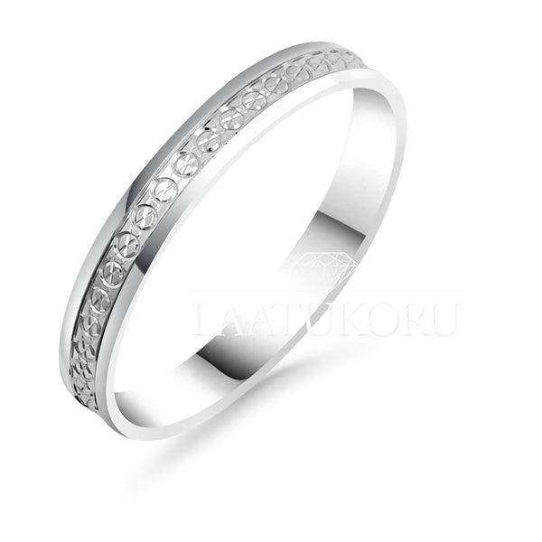 Valkokultainen kihlasormus kuvioinnilla Kohinoor kihlasormus kuvioidulla timanttileikatulla pinnalla, saatavilla myös keltakultaisena! Materiaali: 14K ValkokultaRungon leveys: 2,9mmPinta: timanttileikattuTuotenumero: 003-311V