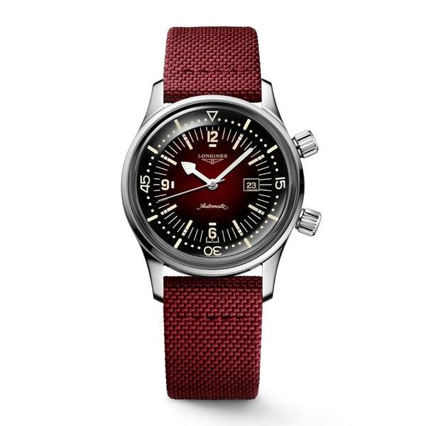 The Longines Legend Diver L33744402 rannekellossa on alkuperäinen 1960-luvun muotoilu ja nykyaikaiset ominaisuudet The Longines Legend Diver on uudelleentulkinta 1960-luvun legendaarisesta sukeltajankellosta. Kellossa on säilytetty ajan henki yksinkertaisine linjoineen ja lisätty nykyaikaisia teknisiä ominaisuuksia. Kellossa on teräksenharmaa 36 mm leveä kuori ja viininpunainen kellotaulu. Kellotaulua ympäröi sisäinen ja sisäänpäin kääntyvä sukeltajan kehä. Kellossa on viininpunainen kangasranneke. Longines Heritage-malliston kellossa on automaattikoneista 45 tunnin käyntivaralla sekä naarmuuntumaton safiirilasi heijastuksenestopinnoitteella. Kellon vesitiiveys on 300 metriä, jolloin se kestää myös sukeltamista. Mallinumero: L3.374.4.40.2Kuoren materiaali: ruostumaton teräsKuoren väri: teräksenharmaaKuoren halkaisija: 36 mmKellon paksuus: 11,9 mmRannekkeen materiaali: synteettinen, kangasRannekkeen väri: viininpunainenRannekkeen leveys: 19 mmKellon paino: 62,8 gSafiirilasi, naarmuuntumatonKellotaulun väri: viininpunainenVesitiiviys: 300 metriä (30 bar)Koneisto: automaattiKäyntivara: 45 tuntia Katso kaikki Longines-kellot täältä