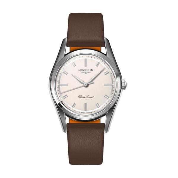Longines Silver Arrow L28344722 rannekellossa on historiallinen muotoilu nykyaikaisilla ominaisuuksilla Longines Heritage Classic -malliston kelloissa yhdistyy historiallisten mallien alkuperäinen muotoilu ja nykyaikainen kellonvalmistustekniikka. Tässä Silver Arrow -mallissa on 38,5 mm leveä teräskuori hopeanvärisellä kellotaululla. Kellotaulussa on teräksenharmaat muotoillut indeksit ja kiiltävät, hopeoidut osoittimet. Indekseissä ja osoittimisissa on myös luminointi helpottamaan kellon lukemista pimeässä. Teräksenharmaaseen kuoreen yhdistyy ruskea nahkainen ranneke. Longines Heritage-malliston kellossa on automaattikoneista 72 tunnin käyntivaralla sekä naarmuuntumaton safiirilasi heijastuksenestopinnoitteella. Mallinumero: L28344722Kuoren materiaali: ruostumaton teräsKuoren väri: teräksenharmaaKuoren halkaisija: 38,5 mmKellon paksuus: 9,9 mmRannekkeen materiaali: nahkaRannekkeen väri: ruskeaRannekkeen leveys: 19 mmKellon paino: 59.5 gSafiirilasi, naarmuuntumatonKellotaulun väri: hopeaVesitiiviys: 30 metriä (3 bar)Koneisto: automaattiKäyntivara: 72 tuntia Katso kaikki Longines-kellot täältä