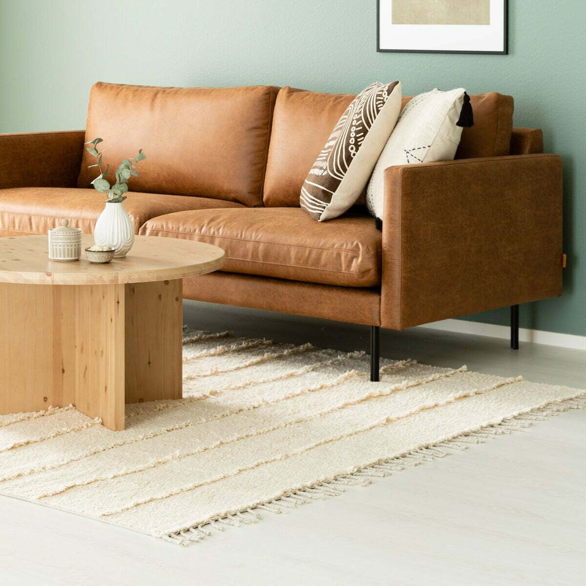 Tuohi -puuvillamatto on ihanan pehmyt jalalle. Neutraalit, luonnonläheiset sävyt tuovat rauhallista tunnelmaa sisustukseen. Punotut hapsut maton päädyissä, sekä pidemmät nukkaraidat pinnassa tekevät matosta rennon eläväisen näköisen.