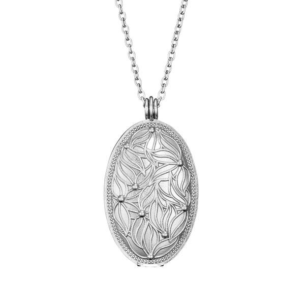 Lumoava Primavera hopeariipus, iso medaljonki Materiaali: hopeaKoko: 26×48 mmKetjun pituus: 70/85 cmTuotenumero: L56201910000Muotoilija: Carina Blomqvist Soikea, hopeinen medaljonkiriipus, jossa hopeinen ketju. Medaljonki aukeaa korun yläosasta ja sen sarana on korun alaosassa. Ketju pitää medaljongin tiukasti kiinni silloin, kun ketju on paikallaan ja koru kaulassa. Ketjun pituus on säädettävissä.Primavera-sarjan medaljongit olivat pitkään muotoilija Carina Blomqvistin haaveissa. Muotoilijan omasta nuoruudesta tutut medaljongit olivat aikanaan hyvin suosittuja, ja niiden sisään sai laitettua itselle tärkeitä kuvia. Nyt hän halusi päivittää perinteisen korun nykypäivään ja loi medaljongin, johon ei välttämättä tarvitse laittaa kuvaa, vaan siellä voi säilyttää muutakin itselle tärkeää. Kevättä tarkoittava Primavera on kukikas korusarja, jonka ilme on romanttinen. Medaljonkiriipus saatavissa myös paksummalla zirkoniaketjulla. Lumoavan kirkkaat hopeakorut rodinoidaan tummumisen ehkäisemiseksi, joten ne säteilevät kauniina jopa vuosikausia. Korut valmistetaan Kuopiossa, maailman pohjoisimmassa korutehtaassa. Luonto on lähellä Lumoavan sydäntä, ja korujen tuotanto onkin kehitetty mahdollisimman luontoystävälliseksi. Heidän käyttämästään hopeasta yli 90 prosenttia on kierrätettyä. Katso kaikki Lumoava-korut täältä