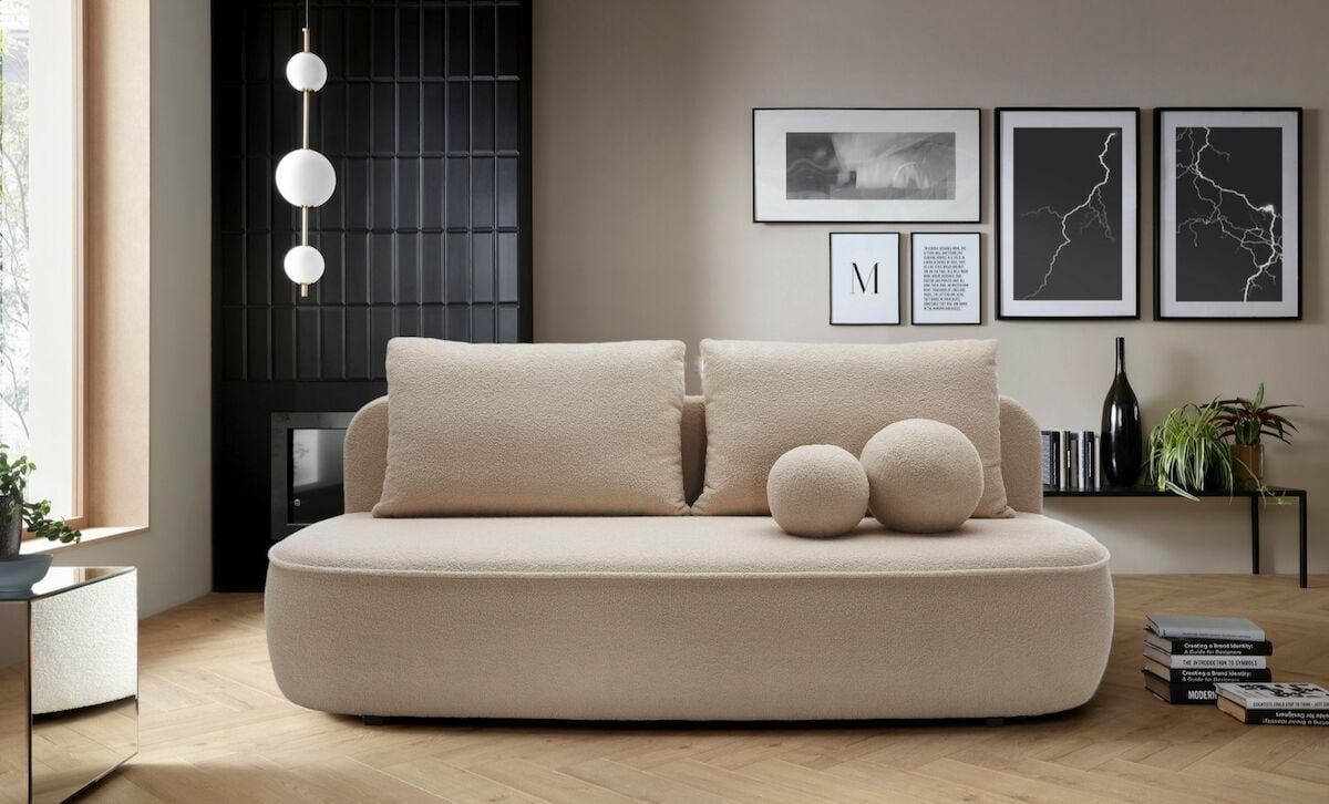 Mooda Calvin on upea vuodesohva, joka lisää pehmeyttä sisustukseen kauniilla pyöreällä muotoilullaan sekä pehmeällä ja eläväpintaisella buklee-kankaallaan. Tyylikäs vuodesohva ei pelkästään täydennä kodin eri tiloja näyttävyydellään, vaan tarjoaa myös laatua ja kestävyyttä. Vuodesohvan mukana tulee kaksi kaunista pallotyynyä, jotka täydentävät vuodesohvan pehmeää ulkonäköä ja lisäävät viimeisteltyä tunnelmaa sisustukseen. Vuodesohvan kätevä mekanismi mahdollistaa nopean ja vaivattoman muuntamisen vuoteeksi. Mekanismi on suunniteltu helppokäyttöiseksi ja kevyeksi, jotta voit nauttia vuodesohvan käytöstä huolettomasti. Lisämukavuutta tuo vuodesohvan sisältä löytyvä tilava vuodevaatelaatikko, joka tarjoaa käytännöllisen ratk…