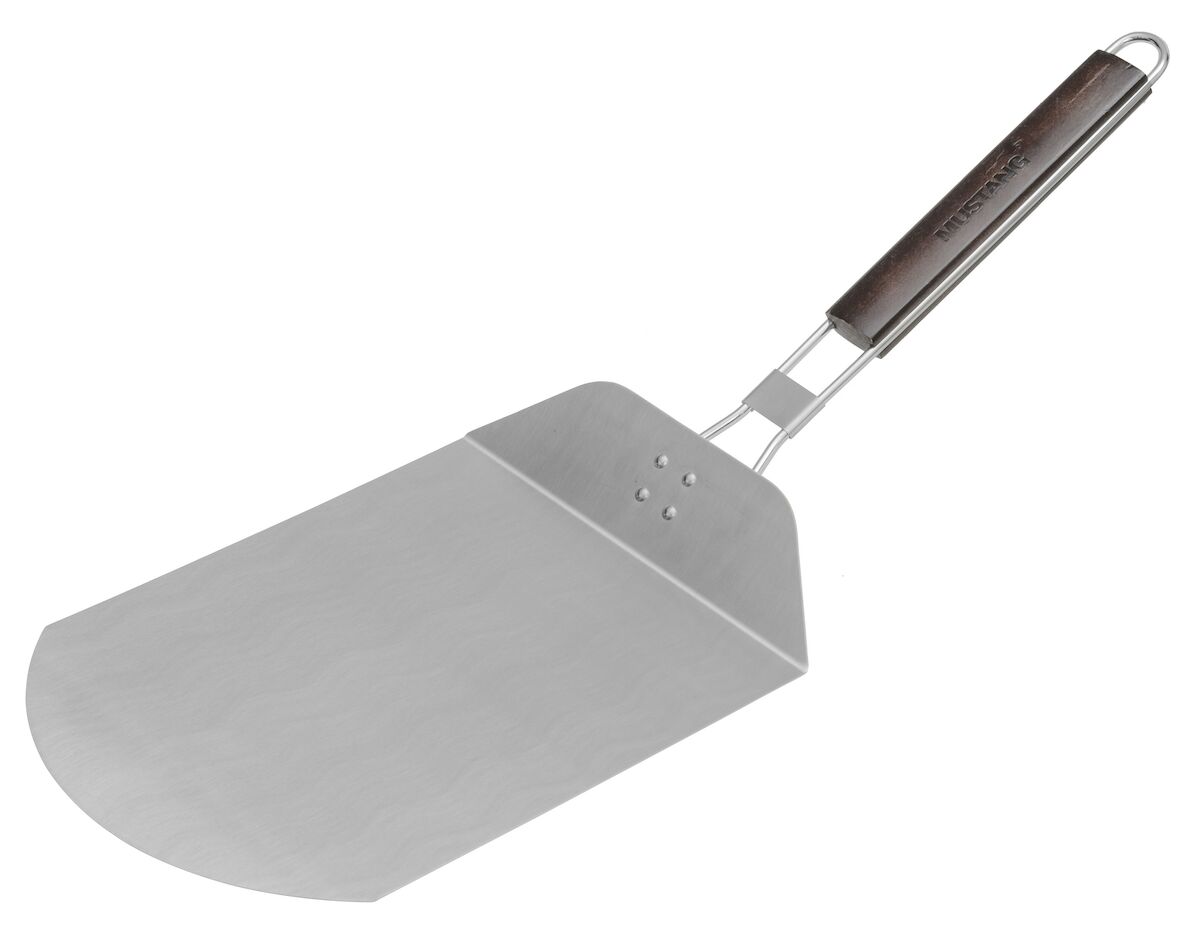 Teräksinen pizzalapio puukahvalla helpottaa pizzan siirtämistä uuniin. Kokoontaitettava. Pituus 65 cm, lastan 30 x 25 cm.