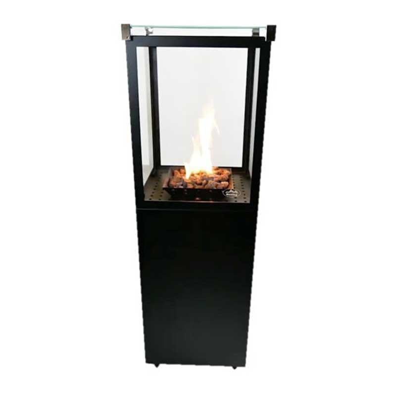 Muztag-valmistajan upea musta Marbella-terassilämmitin, joka käyttää polttoaineenaan nestekaasua. Kaasupullo säilyy piilossa terassilämmittimen rungon sisällä.
