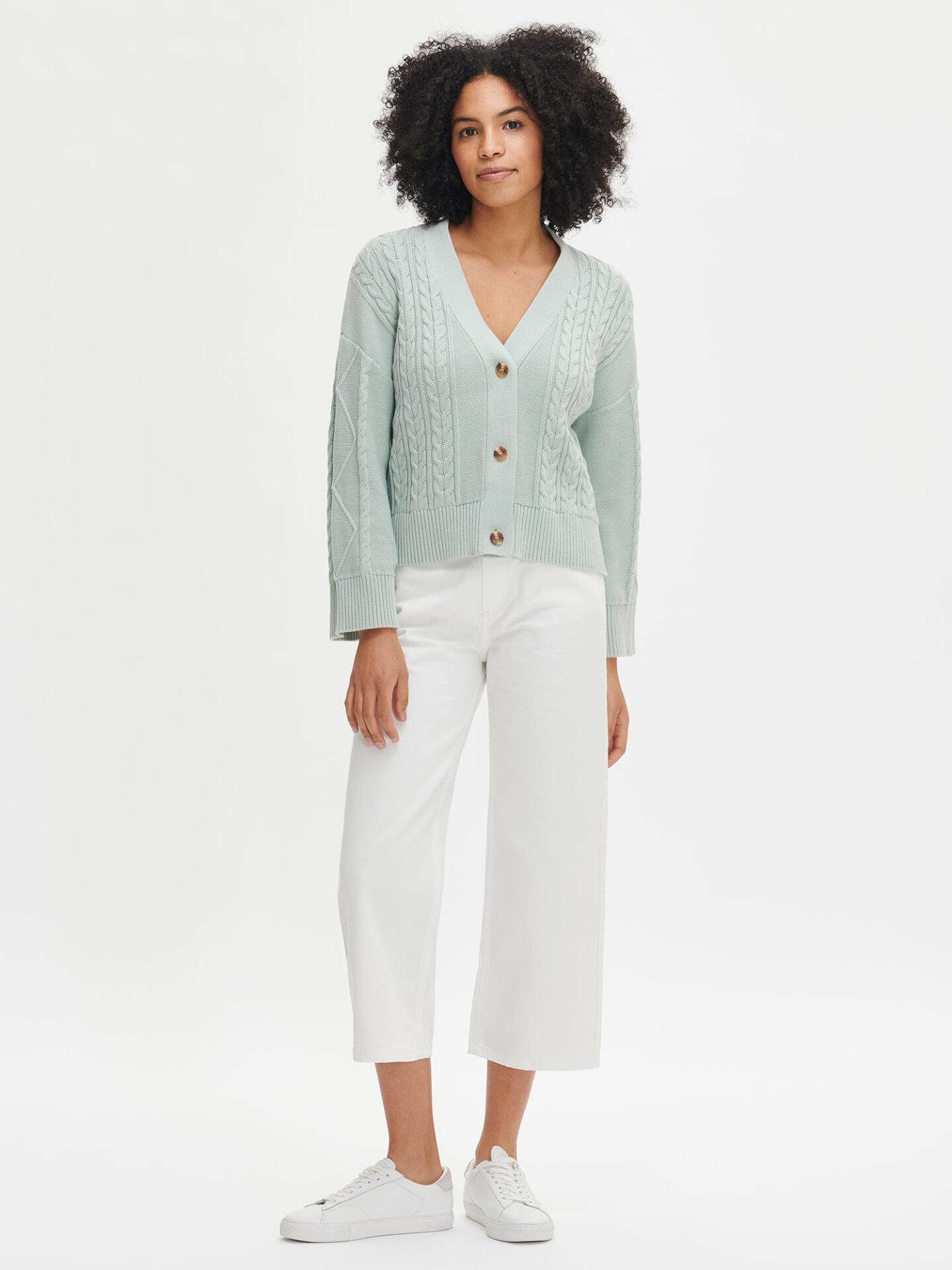 Naisten sinivihreä Coletta-neuletakki kauniilla palmikkokuviolla. Laadukas puuvillaneuletakki on luottovaate arjen pukeutumiseen. Muotoonneulotussa neuletakissa on hieman vajaamittaiset hihat ja edessä napitus. Neuleessa on kaunis palmikkokuviointi ja hihansuissa sekä helmassa on resori. Tuotteen pituus koossa M on noin 58 cm. Neuletakki on valmistettu laadukkaasta sertifioidusta puuvillasta.