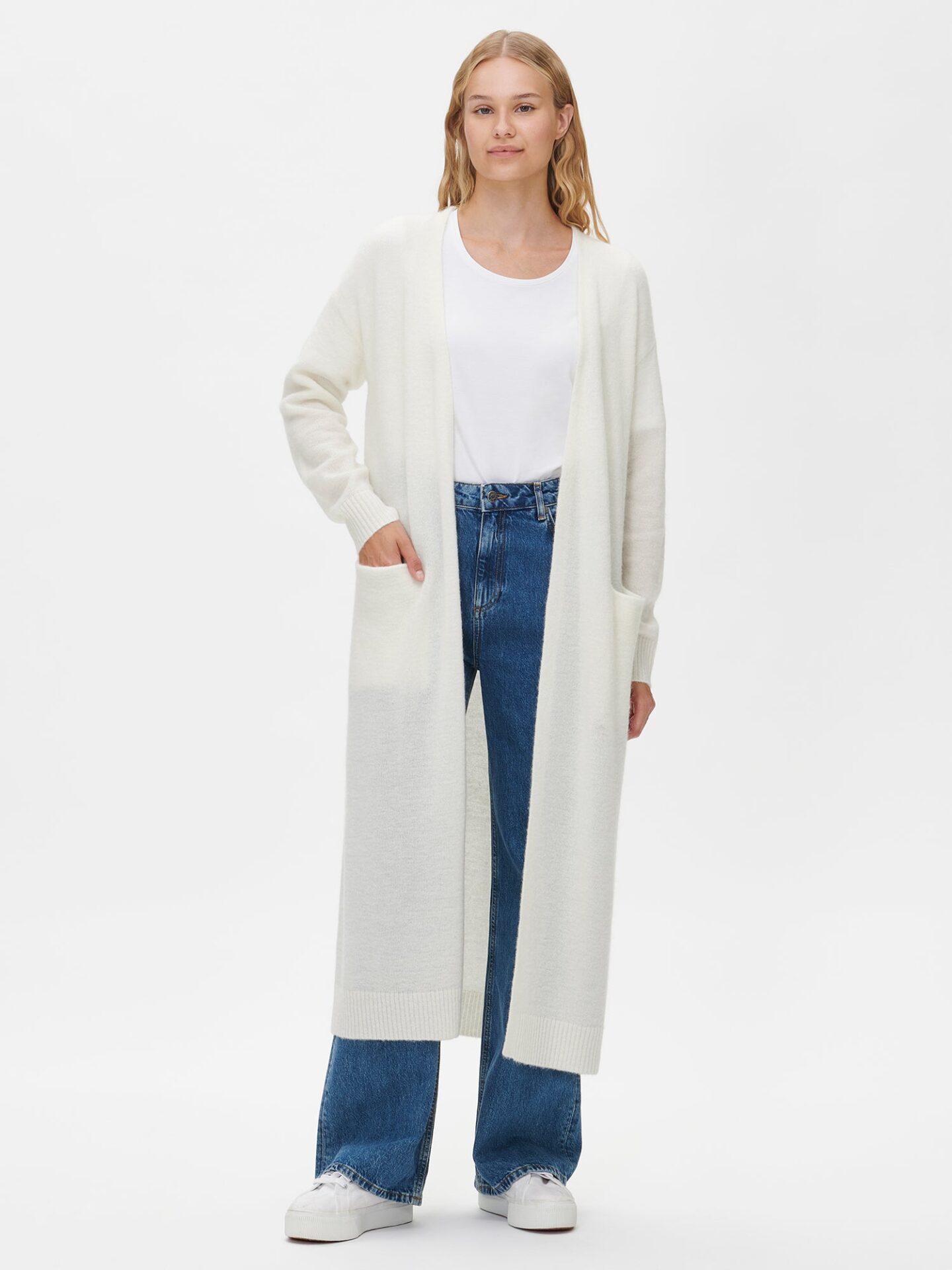 Naisten ylellinen pitkä valkoinen Humina-neuletakki. Neuletakissa on täyspitkät hihat ja taskut edessä. Neuletakissa on resori helmassa ja hihansuissa. Neuletakin pituus koossa M on noin 115 cm. Muhkean neuletakin neulos on sekoite, jossa on osaksi sertifioitua mohairia, sertifioitua villaa, kierrätettyä polyesteria, polyamidia ja hieman elastaania. Neuleen hoito-ohjeet löydät täältä (https://nanso.com/blogs/news/villaneuleen-hoito-opas).