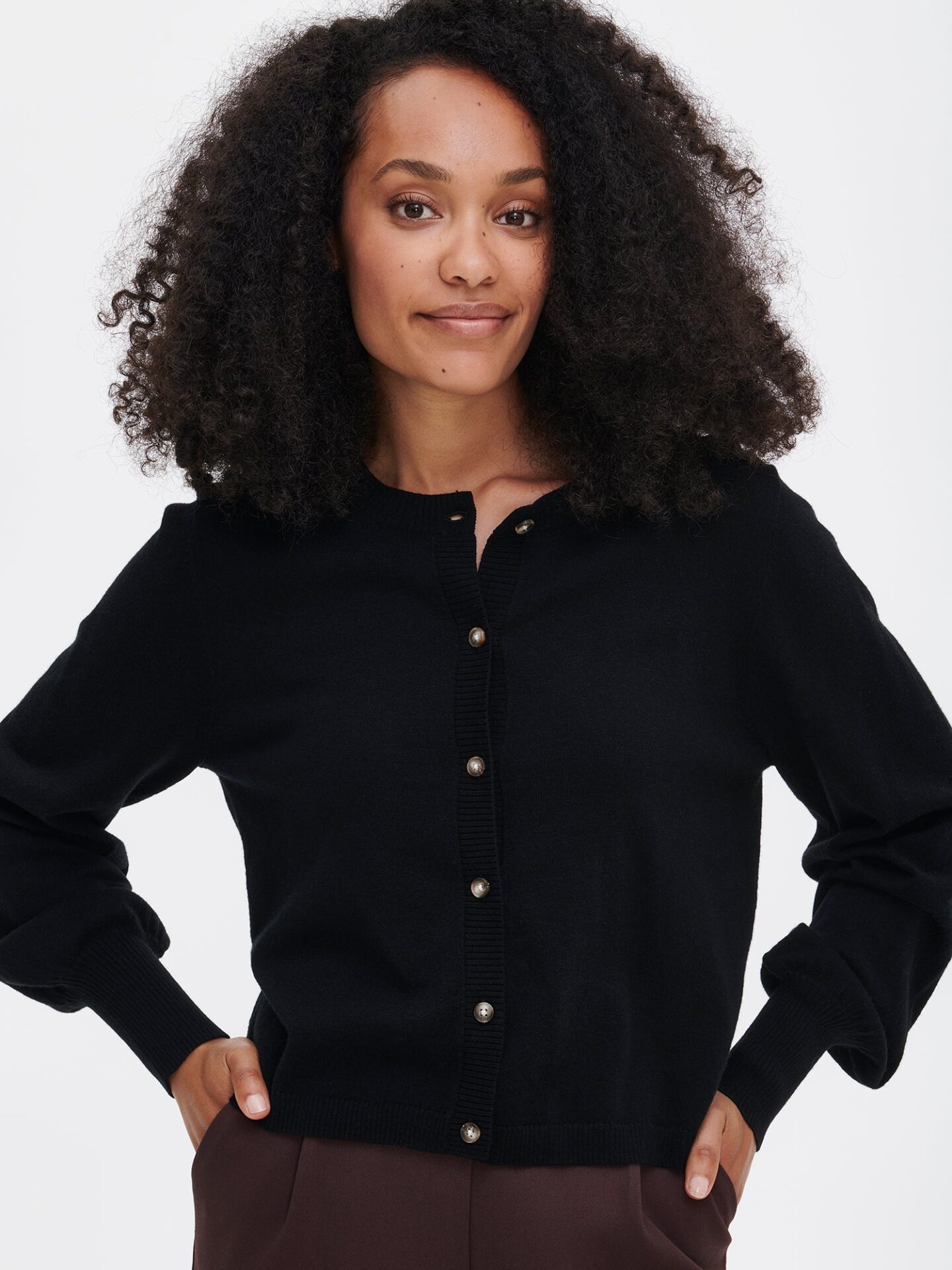 Naisten musta Villis-neuletakki pitkillä hihoilla. Tyylikäs villatakki on ajaton luottovaate, joka on helppo yhdistää moniin eri asukokonaisuuksiin. Mukava neuletakki on neulottu laadukkaasta merinovillan ja puuvillan sekoitteesta. Neuletakissa on edessä napitus sekä resori helmassa ja hihansuissa. Neuleen hihat ovat täyspitkät. Neuletakin pituus koossa M on noin 55 cm. Tuotteen valmistuksessa on käytetty sertifioitua mulesing-vapaata merinovillaa. Neuleen hoito-ohjeet löydät täältä. (https://nanso.com/blogs/news/villaneuleen-hoito-opas)