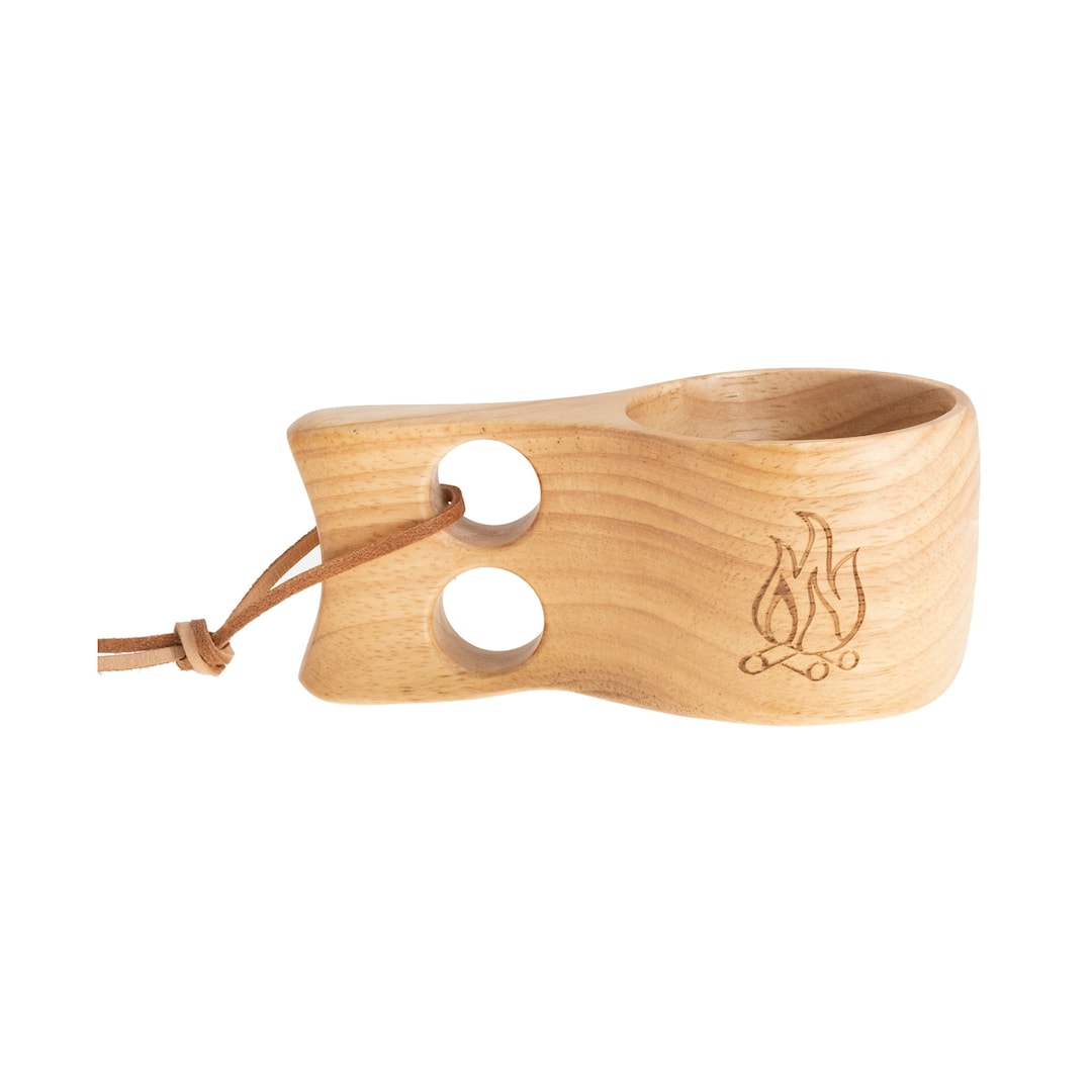 Nortrek kuksa, jossa nuotio-logo ja nahkaremmi. Vastuullisesti tuotettua kumipuuta. Kuksa on käsinpestävä.