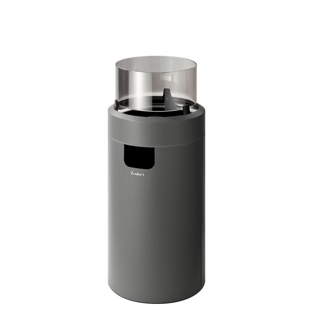 Harmaa Nova-kaasutakka keskikokoisena mallina. Yläosan LED-valo korostaa liekkejä kauniisti.