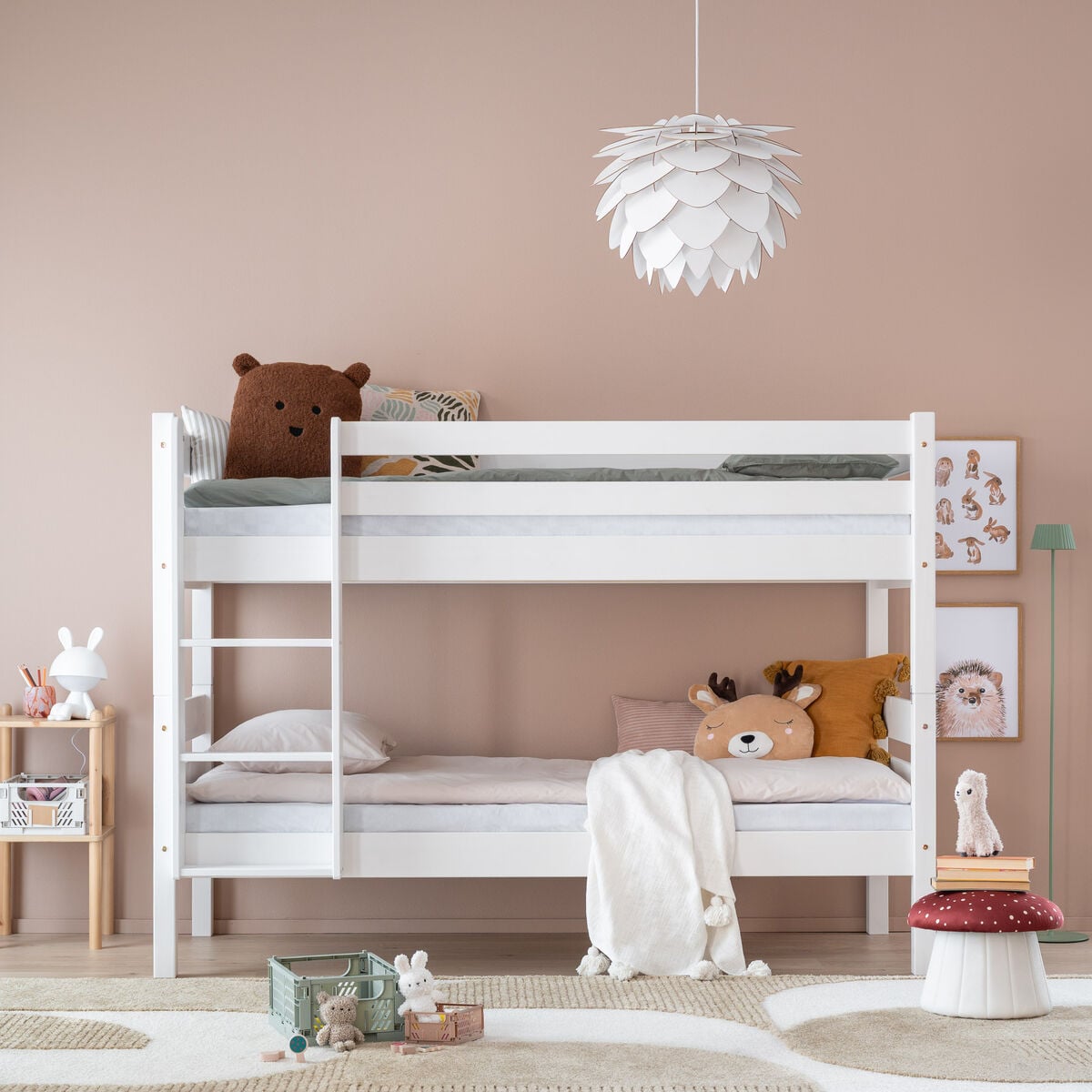 Nukkumatti kerrossänky yhdistää tyylikkään designin ja käytännöllisyyden. Sängyssä on tukeva mäntyrunko ja normaali 80×200 cm vuodekoko sopii täydellisesti kaikenikäisille käyttäjille. Kätevyyttä lisää sänkyjen mahdollisuus erottaa ne kahdeksi erilliseksi sängyksi – täydellinen valinta joustavaan sisustukseen. Kuultovalkoinen viimeistely tuo kotiisi luonnonläheistä tunnelmaa ja antaa kauniisti puunsyiden kuultaa pinnan läpi. Pinta on käsitelty M1-luokan vaatimukset täyttävällä aineella, mikä tekee siitä turvallisen valinnan myös herkille käyttäjille. Tikkaat voi kiinnittää kummalle tahansa puolelle, ja turvalaidan korkeus (36 cm sälepohjasta) tuo mielenrauhaa perheen pienimpien käytössä. Alasänkyyn on saatavilla erikseen ostettava lisäturvalaita, joka lisää…