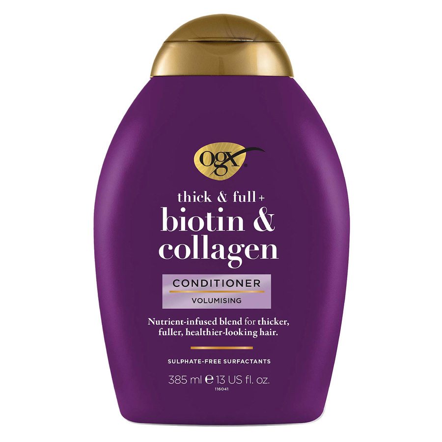 Ogx Biotin & Collagen Conditioner on ravitseva ja tuuheuttava hoitoaine. Tuotesarja sisältää B7-vitamiinia biotiinia, kollageenia ja vehnäproteiinia, jotka auttavat hiuksia säilyttämään kosteuden ja lisäävät tuuheutta jokaiselle yksittäiselle hiussäikeelle. Saat terveet hiukset, jotka tuntuvat paksummilta ja tuuheammilta.