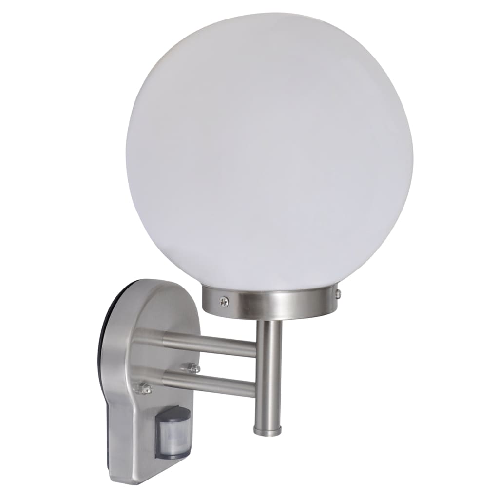 Tämä kaunis lamppu, sen mielyttävällä ja kirkaalla valolla, valaisee puutarhasi, polkusi ja terassisi öisin. Sen liikkeentunnistimen ansioista tämä lamppu syttyy automaattisesti kun se havaitsee liikettä. Sekä havaitsemisetäisyys että syttymisaika voidaan säätää omien halujesi mukaan. Se sopii polttimoille max. teholtaan 60 Wattia. Se on valmistettu Ruostumattomasta teräksestä sekä PMMA:sta, lamppu kestää niin ruostetta kuin säätäkin ja tämä takaa pitkän käyttöiän. Se on helppo asentaa seinälle. Ole hyvä ja ota huomioon, että polttimo EI sisälly toimitukseen. · Mitat: 20 x 23 x 33 cm (P x L x K) · Pidikkeen materiaali: Ruostumaton teräs · Varjostimen materiaali: PMMA · Max. polttimon teho: 60 W (polttimo ei mukana) · Volttimäärä: 50 Hz, 220 – 240 V · Lampun kanta: E27 · Suojataso: IP44 · Mukana sensori joka kytkee valon päälle havaitessaan liikettä