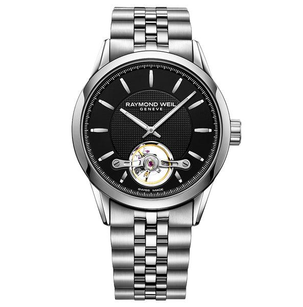 Raymond Weil Freelancer, miesten automaattirannekelloMiesten 42 mm leveä automaattinen Open-rannekello, jossa koneiston yksityiskohtia on näkyvillä. Musta kellotaulu ja teräksen väri. Tuotetiedot:Mallinumero: 2780-ST-20001Koko: miestenKoneisto: automaatti, mekaaninen (38 tunnin käyntivara)Materiaali: ruostumaton teräsKellotaulun koko: 42,5 mmKellotaulun paksuus: 10,6 mm Vesitiiviys: 100 m Safiirilasi Kellotaulun väri: musta Ranneke: ruostumatonta terästä